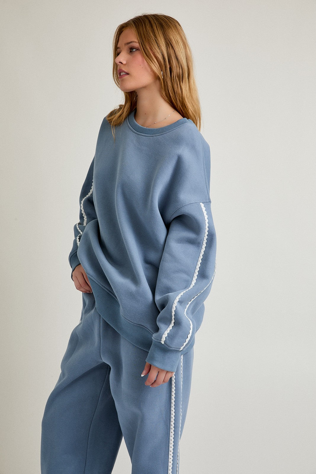 Elevate your casual wardrobe with our Dusty Blue Contrast Trim Sweatshirt. Crafted for comfort and style, this cozy sweatshirt features a relaxed, oversized fit with soft ribbed cuffs and hem for a snug feel. The dusty blue hue is elevated by subtle white contrast trim detailing along the sleeves, adding a trendy touch to classic loungewear. Made from plush, breathable fabric, it’s perfect for layering or wearing solo on cooler days. Pair with matching pants or your favorite jeans for an effortlessly chic, laid-back look. Available in versatile sizing to keep you comfy and stylish all season.