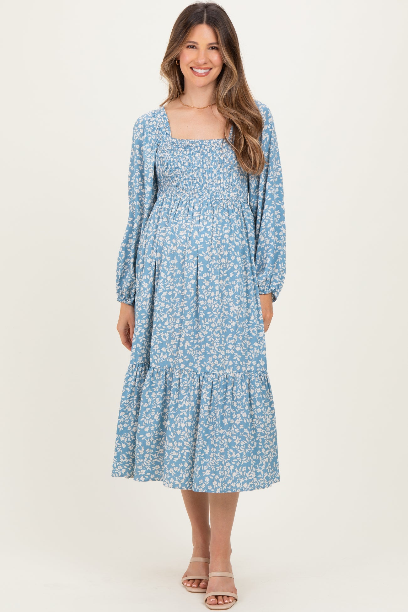 Embrace comfort and style with this floral maternity maxi dress, designed to flatter your baby bump throughout every stage. Featuring a trendy square neckline and smocked bodice, it offers flexible support and a chic, feminine silhouette. The long puff sleeves with elastic cuffs add a delicate touch, while the tiered skirt flows gracefully for ease of movement. Crafted from soft, breathable fabric, this dress ensures all-day comfort whether you're attending a casual outing or a special occasion. Perfect for moms-to-be seeking effortless elegance and practicality in one beautiful piece.