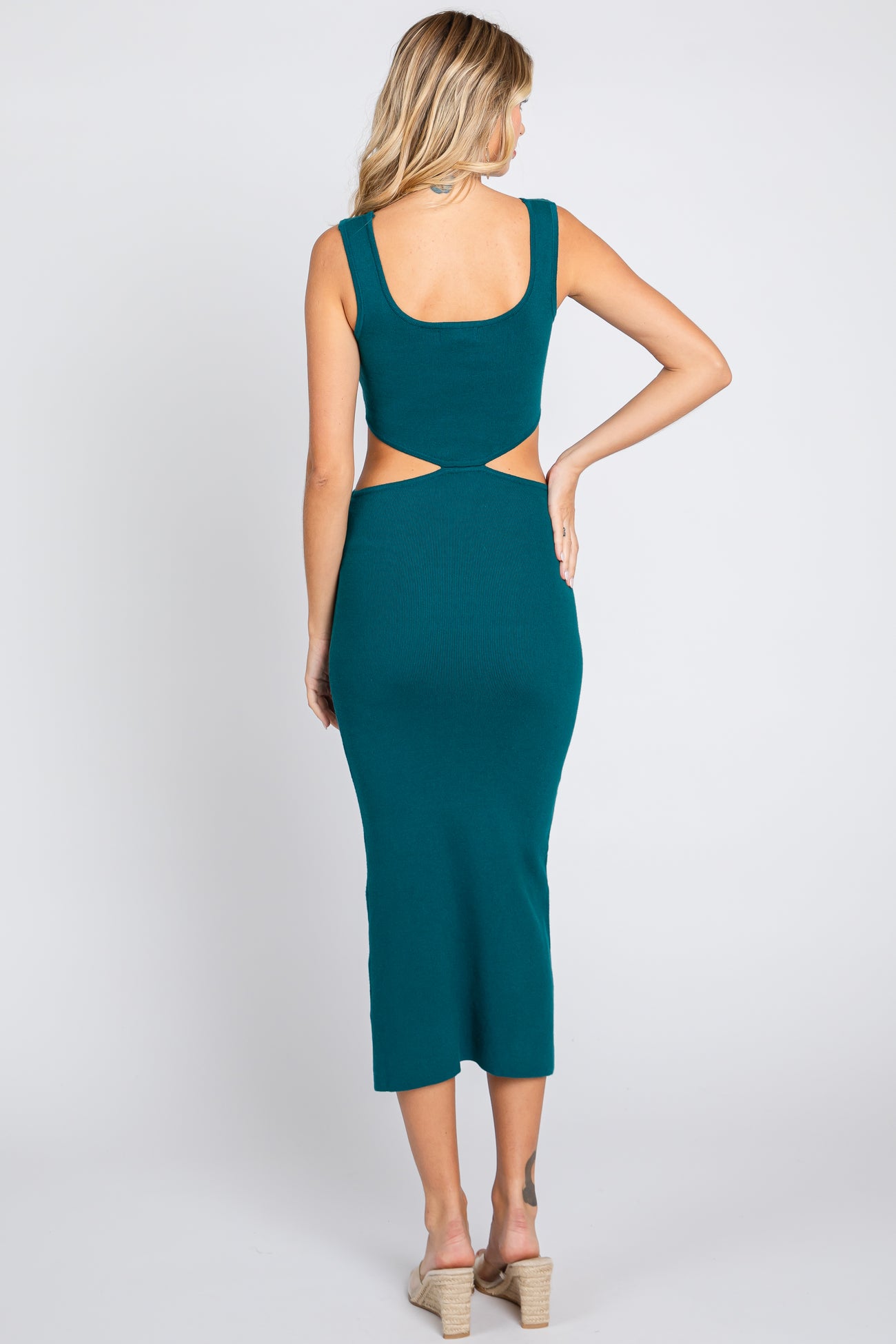 A solid knit midi dress with a scoop neckline and side cutouts.