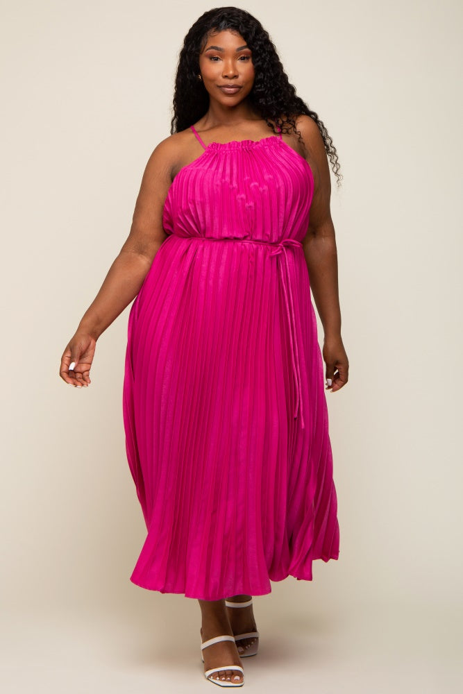 Fuchsia Pleated Sleeveless Waist Tie Plus Maxi Dress