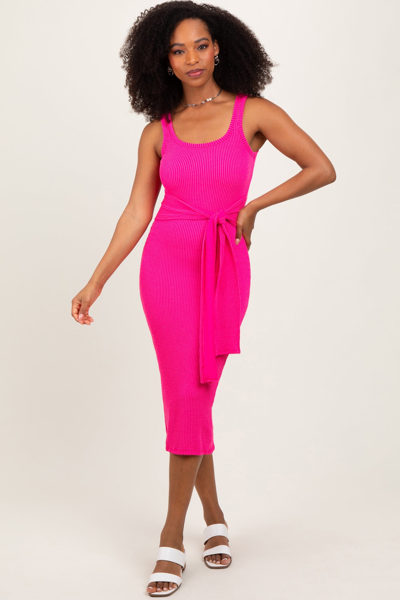 Fuchsia Ribbed Front Tie Sleeveless Midi Dress