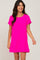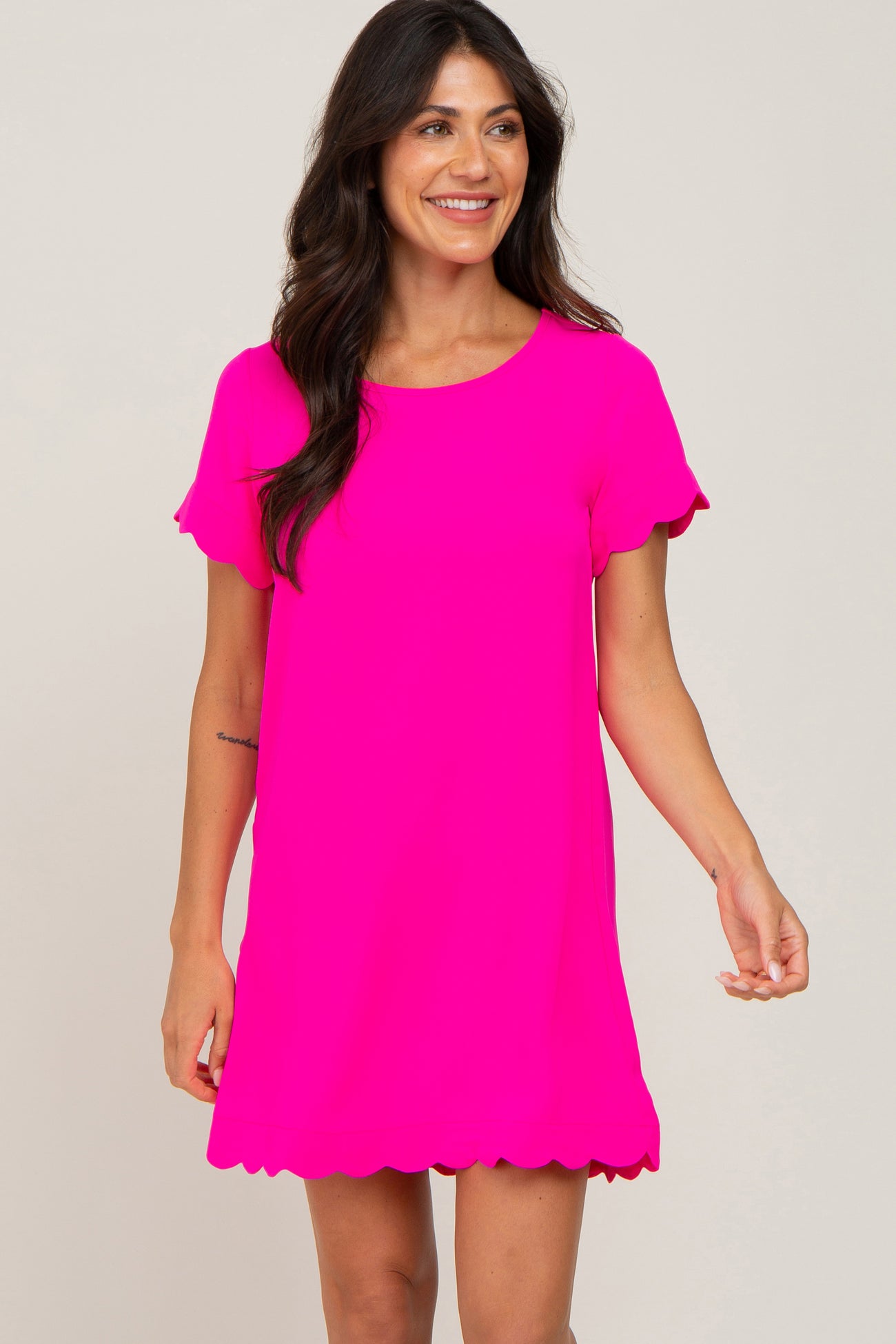Details A solid dress with a rounded neckline, short scalloped sleeves, and a scalloped bottom hem. Content + Care