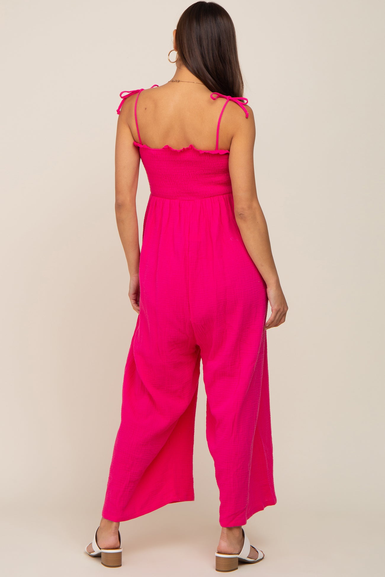 A cropped sleeveless maternity jumpsuit featuring self-tie shoulder straps, a smocked top and a square neckline.