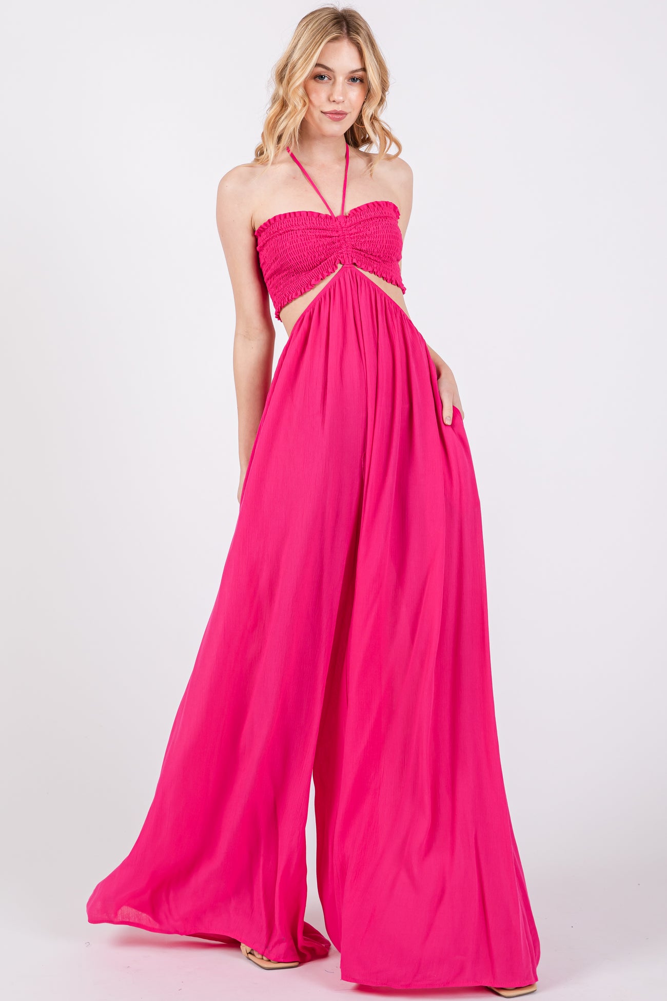 Fuchsia Smocked Drawstring Halter Side Cutout Maternity Jumpsuit