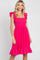 A sleeveless textured dress featuring ruffle shoulder straps, a smocked top, a ruffle hem and a v-neckline.