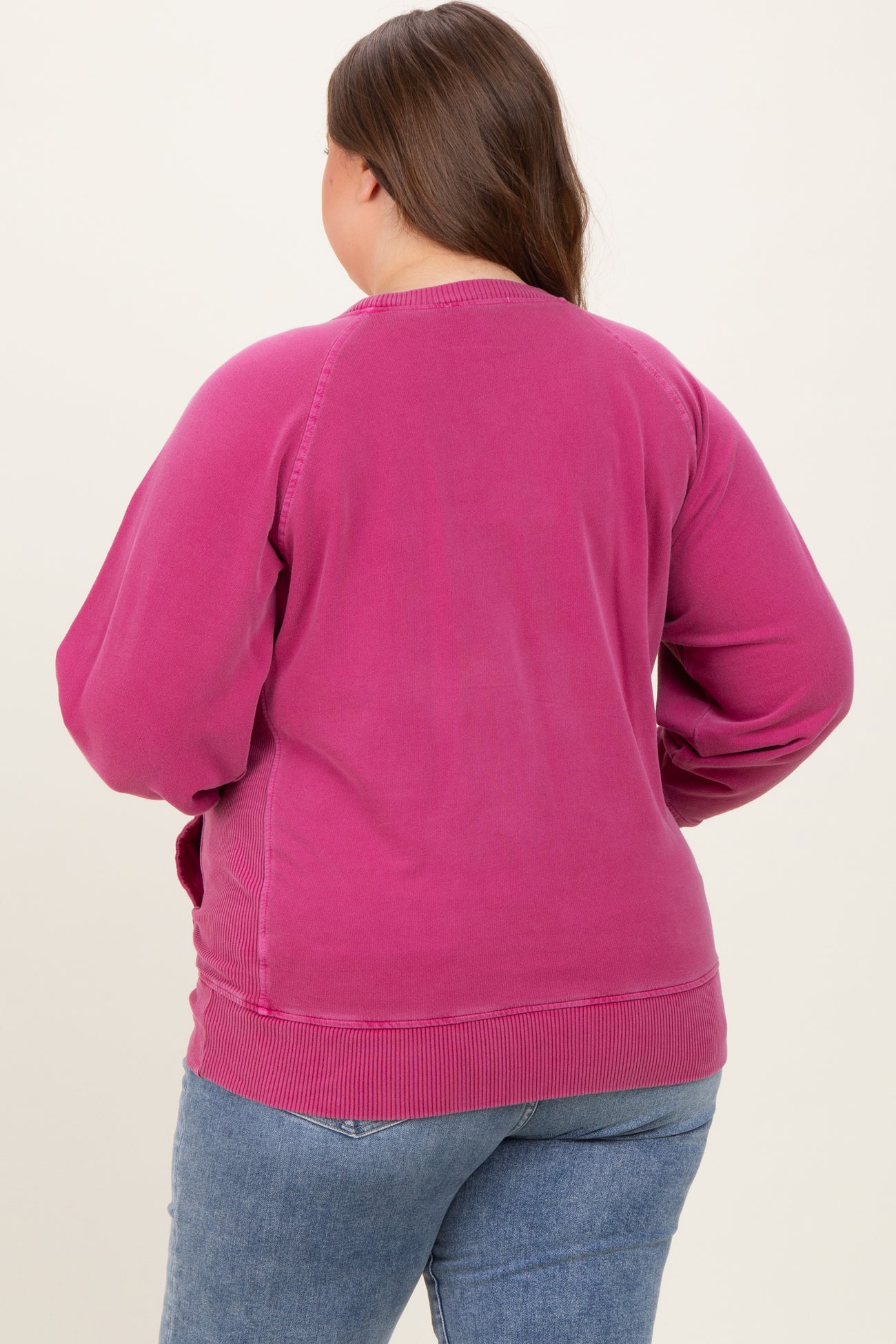Stay cozy and stylish with our Fuchsia Vintage Wash French Terry Maternity Plus Pullover. Crafted from ultra-soft French terry fabric, this pullover offers breathable comfort and gentle stretch to accommodate your growing bump. The vibrant fuchsia color with vintage wash detail adds a trendy, lived-in look perfect for casual days or lounging. Featuring raglan sleeves and ribbed cuffs and hem for a flattering fit, this pullover is designed with maternity-friendly ease and plus size comfort in mind. Pair it with your favorite jeans or leggings for effortless everyday style. Perfect for all trimesters!
