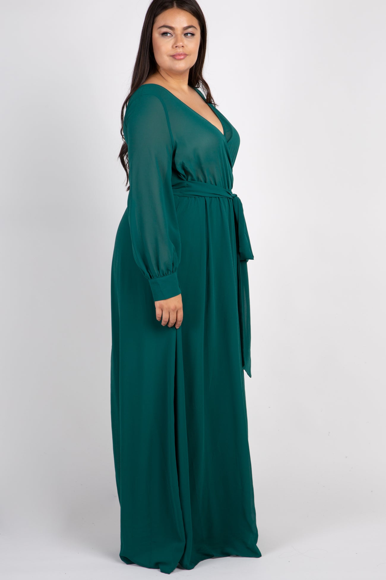 Green Chiffon Long Sleeve Pleated Plus Maxi Dress