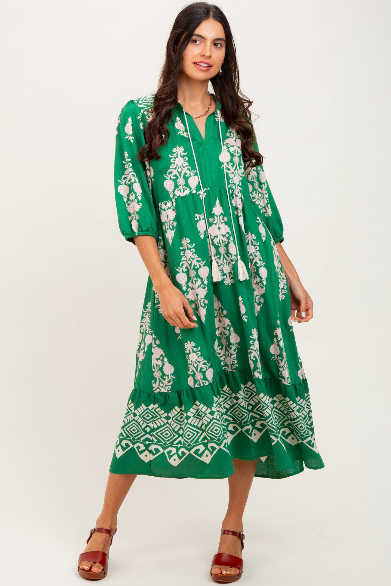 Green Damask Tassel Front Tie Tiered Maternity Midi Dress