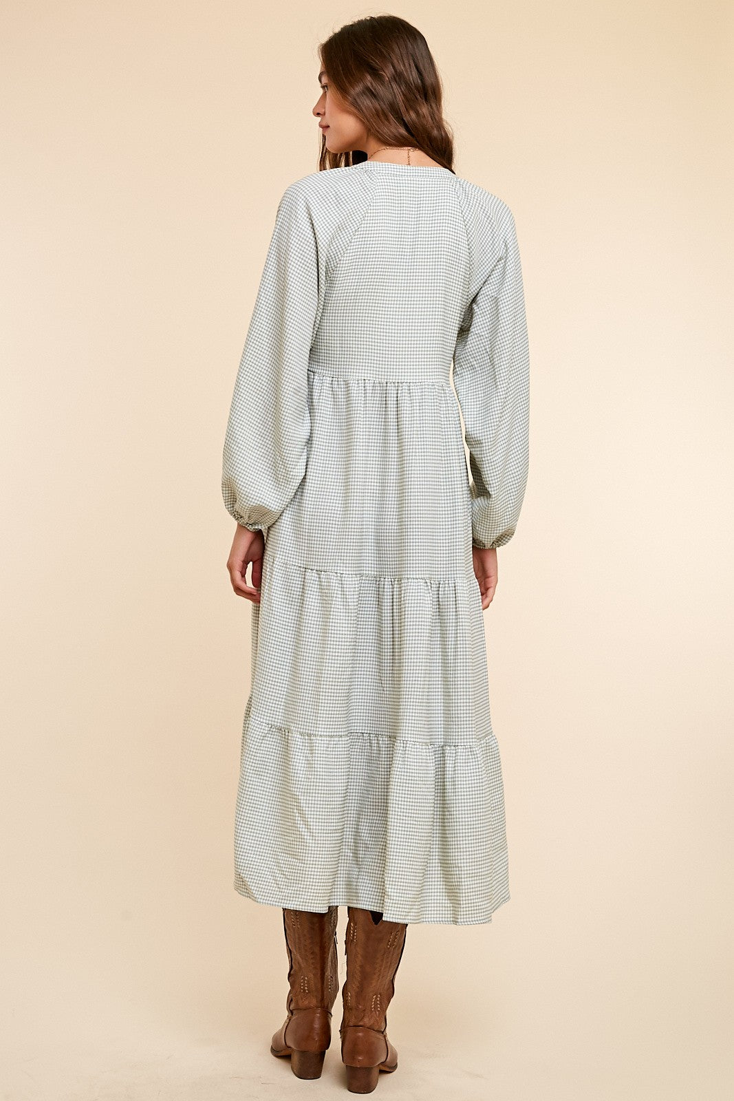Green Gingham Print Button Down Midi Dress