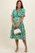 A solid hued maternity dress featuring short puff sleeves, a tiered skirt, side pockets and a ruffle v-neckline.