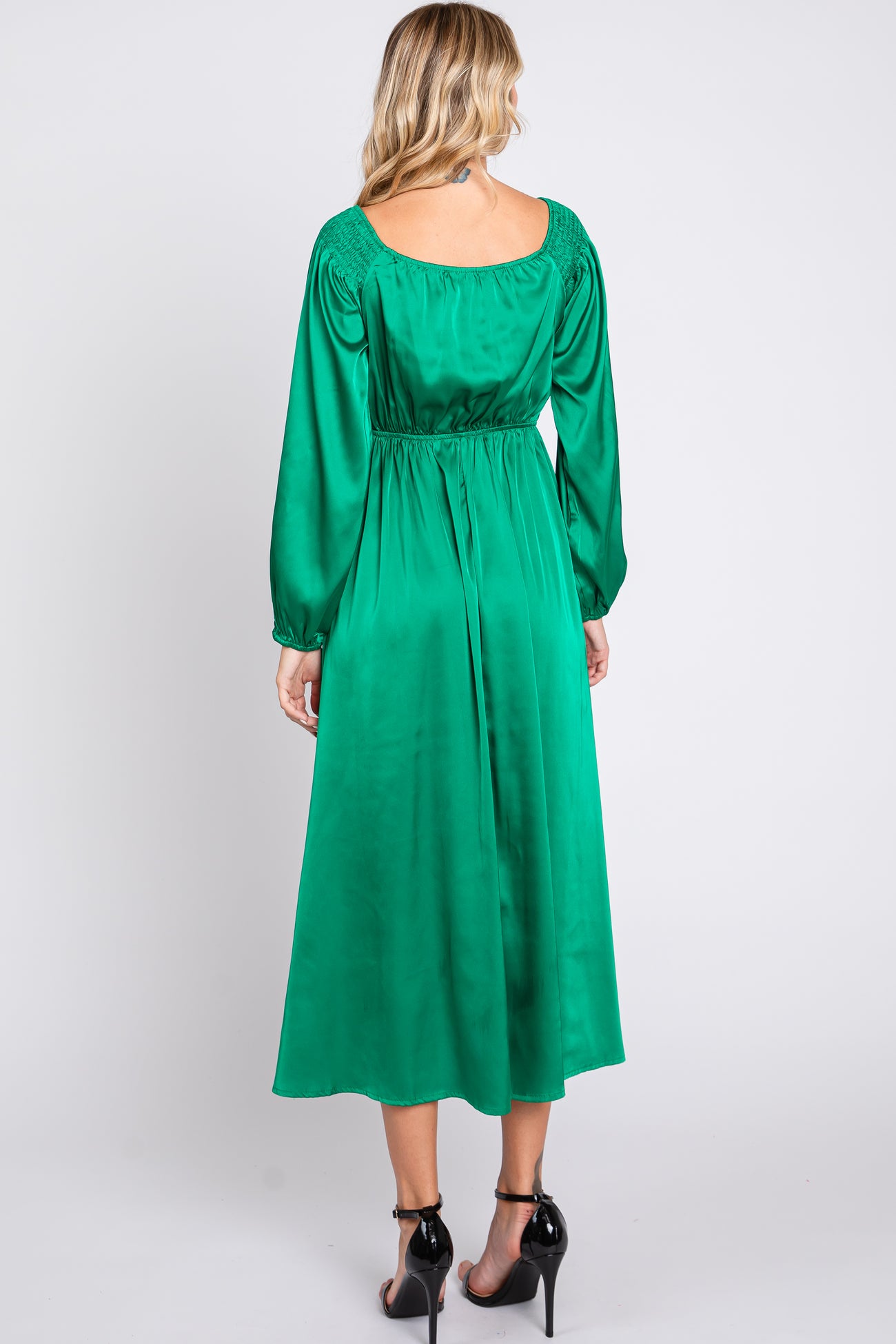 A satin solid hue midi dress with long puff sleeves, smocked accents at the shoulder, a wrap v-neckline with a snap button closure, and an elastic waist.
