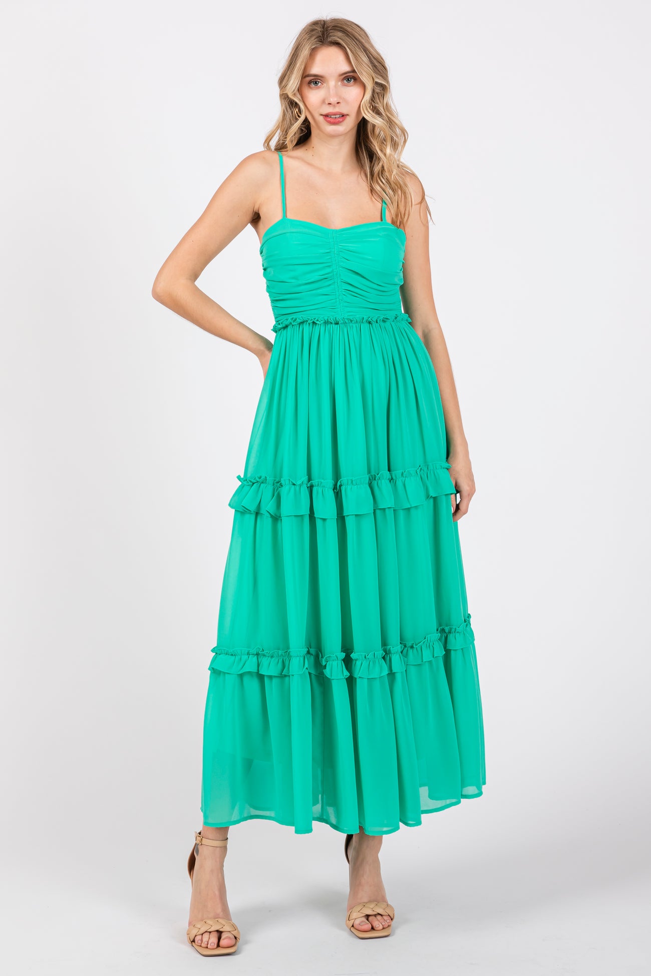 Green Sleeveless Pleated Ruffle Tiered Midi Dress
