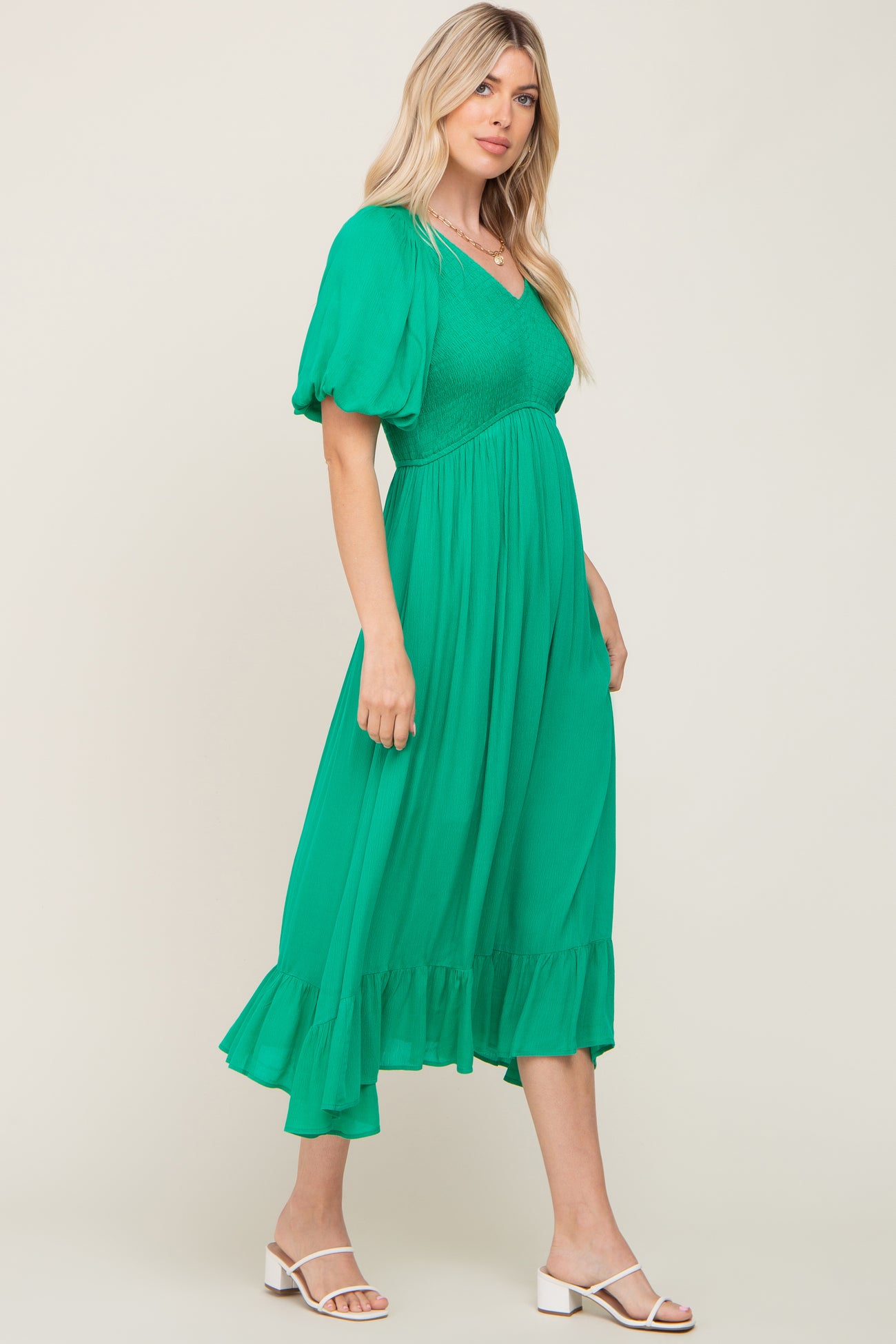 A solid midi dress with a v-neckline, smocked bodice, and puff sleeves. Dress is partially lined.