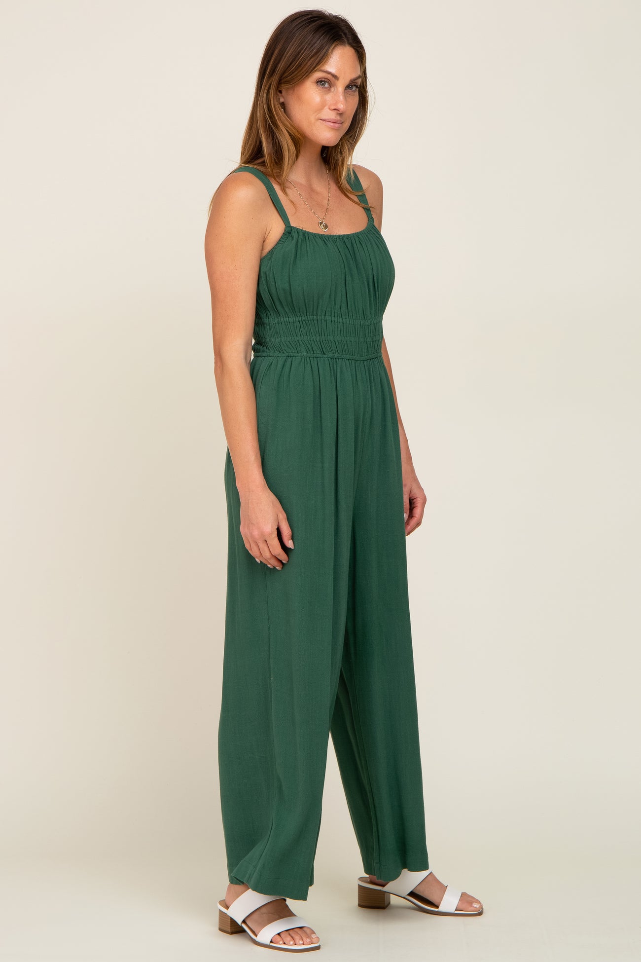 Green Smocked Square Neck Sleeveless Linen Jumpsuit