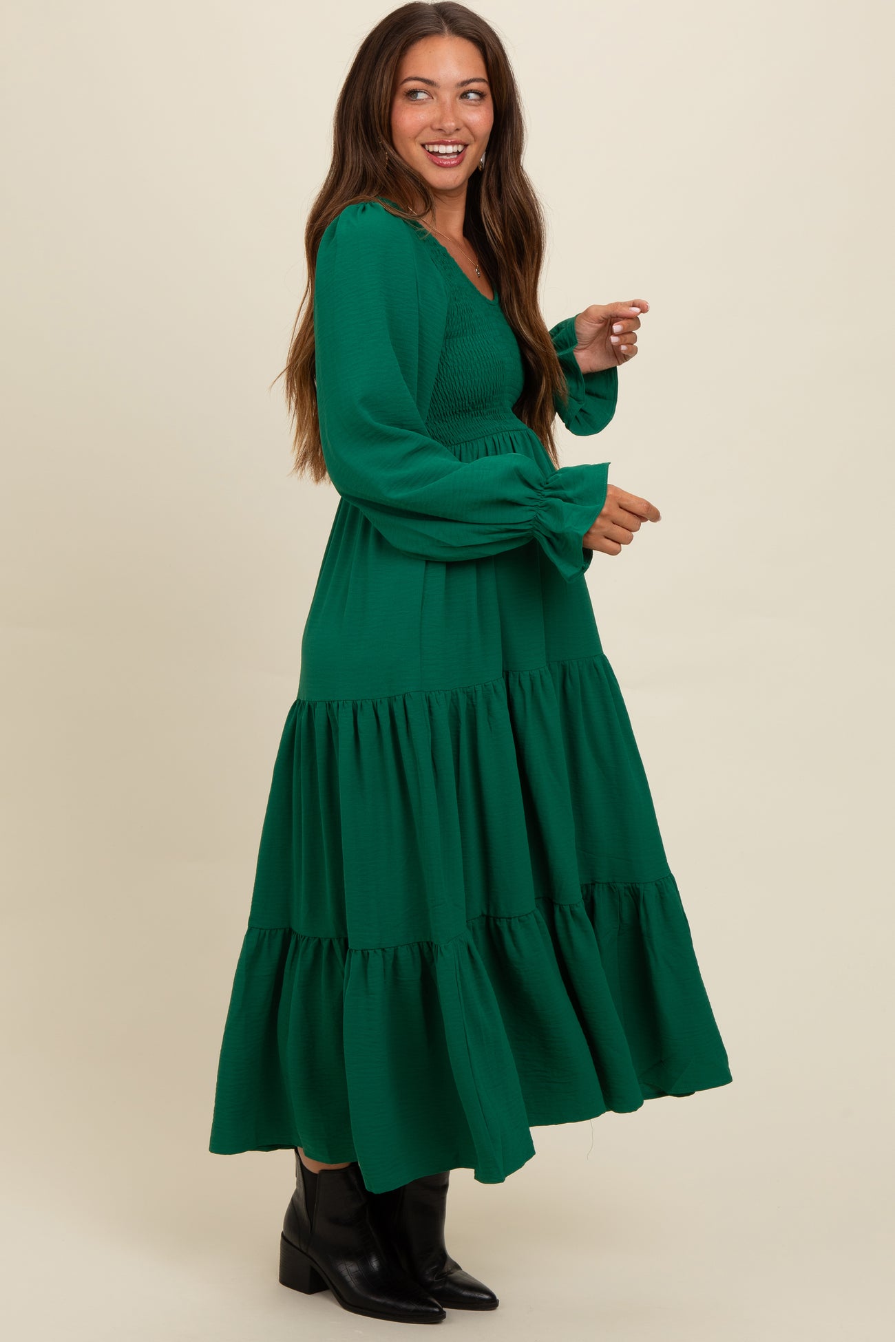 Green Smocked Tiered Long Sleeve Maternity Maxi Dress