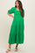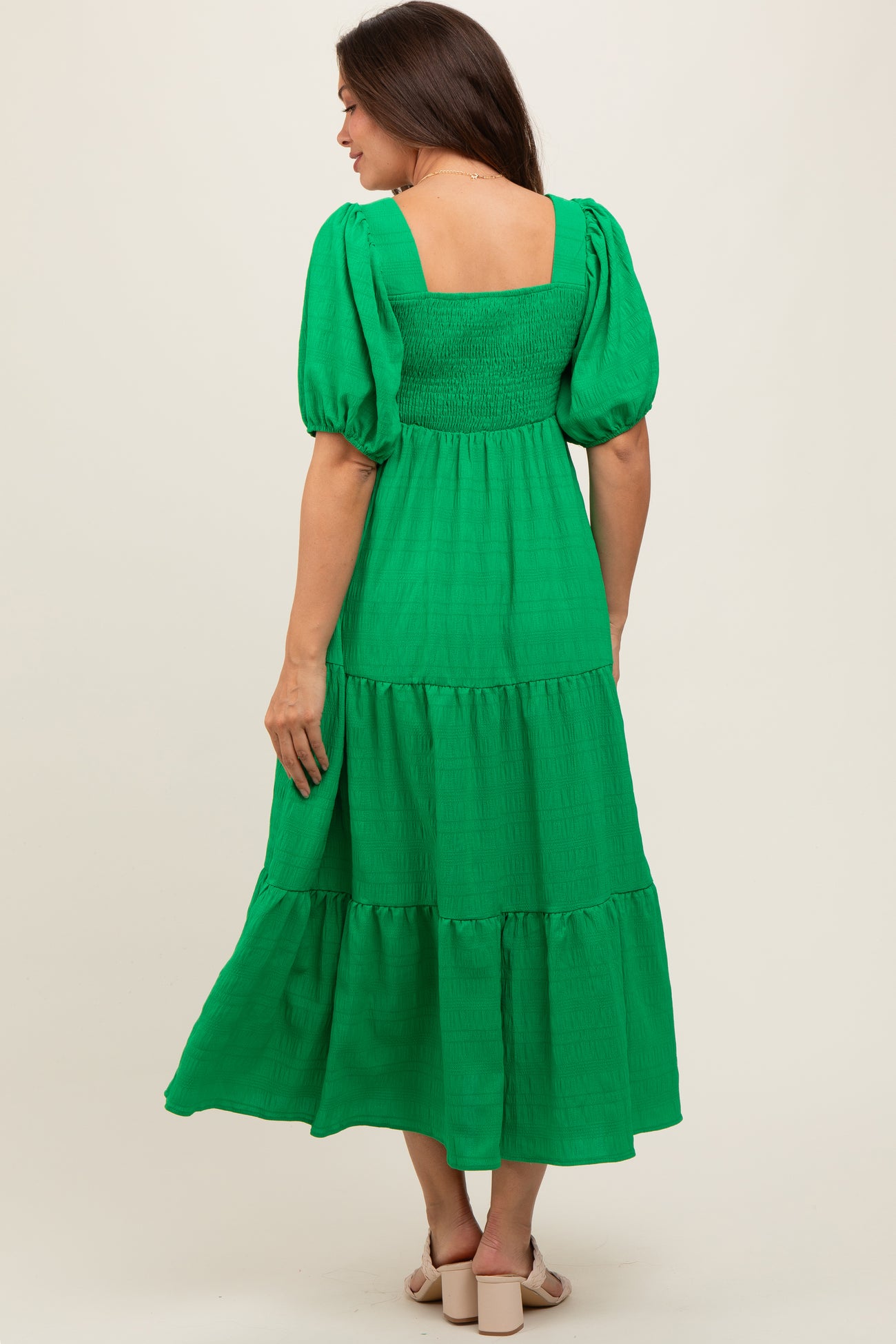 A solid tiered maternity midi dress in a textured material with a smocked bust and puff sleeves. Dress is double lined.