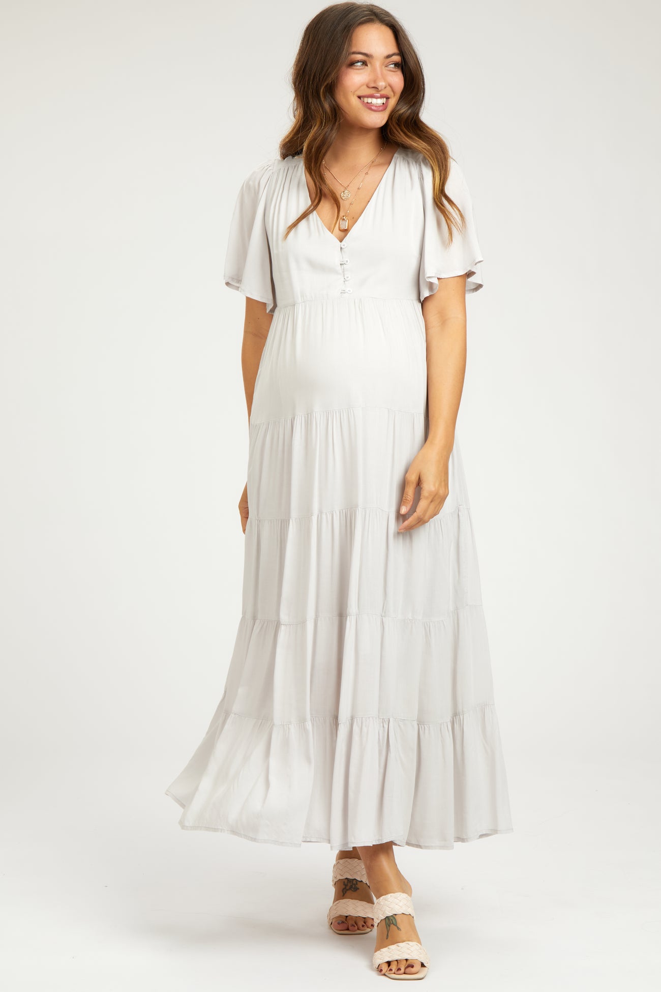 A solid maternity maxi dress with short sleeves, v-neckline, button detail on chest, and tiered skirt. Dress is double lined.