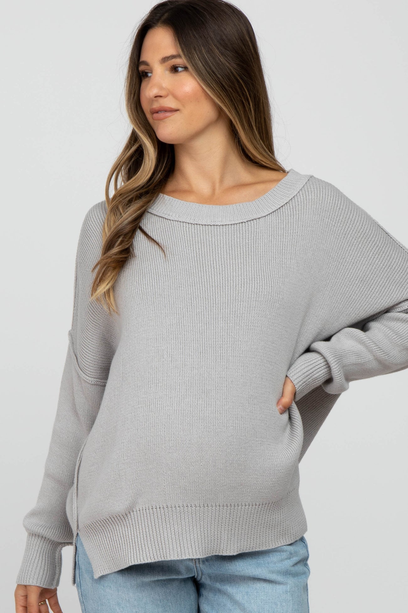 A maternity sweater featuring a crew neckline, ribbed trim, exposed seam detailing, long sleeves and side slits.
