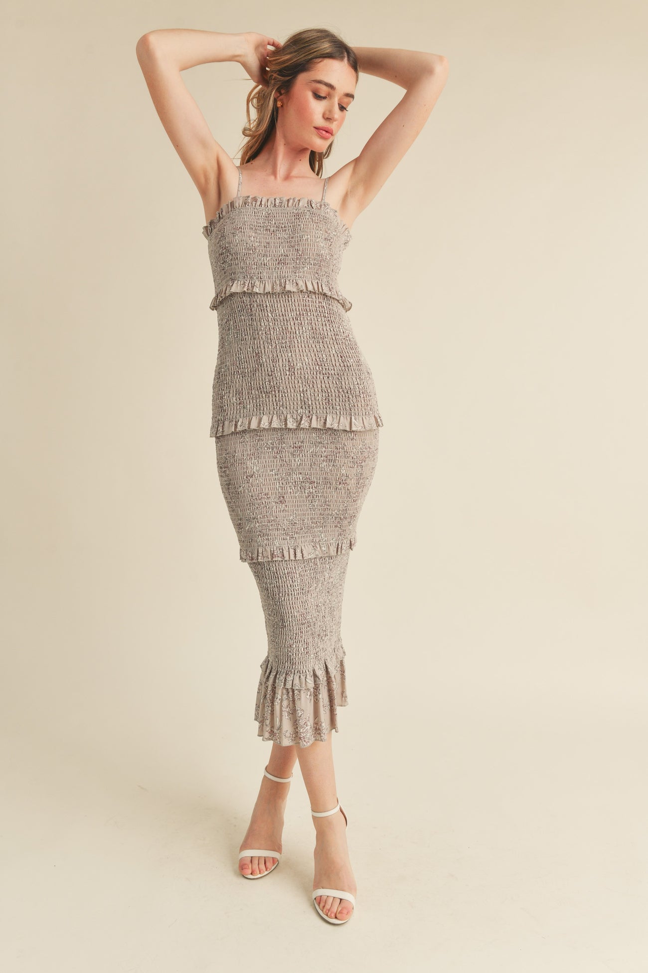 A floral midi dress featuring a smocked elastic body with ruffle trim tiers and adjustable cami straps.