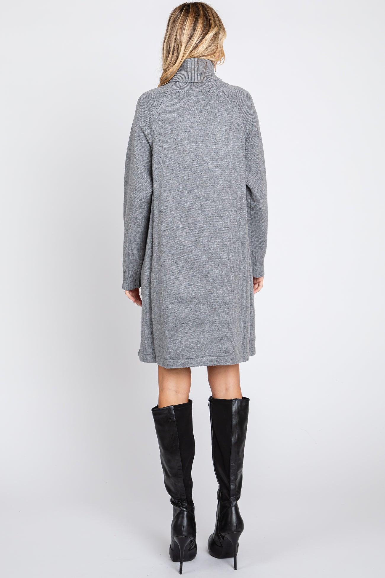 A knit sweater dress featuring long sleeves and a fold-over turtle neckline.