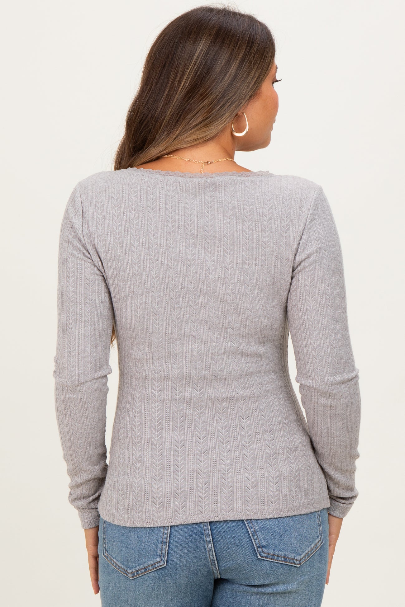 Grey Pointelle Knit Lace Trim Square Neck Maternity Top