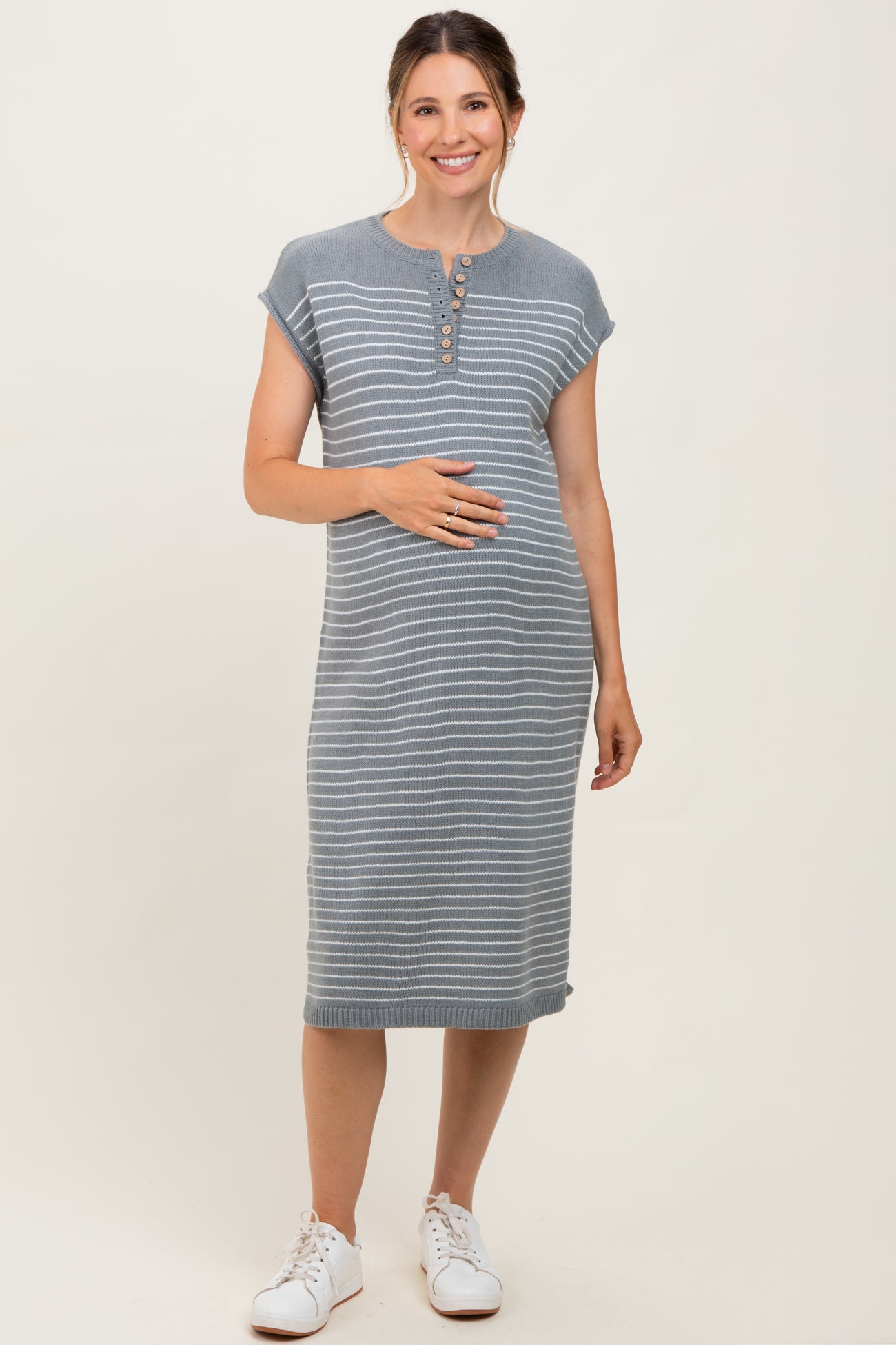 Grey Striped Knit Button Detail Maternity Midi Dress
