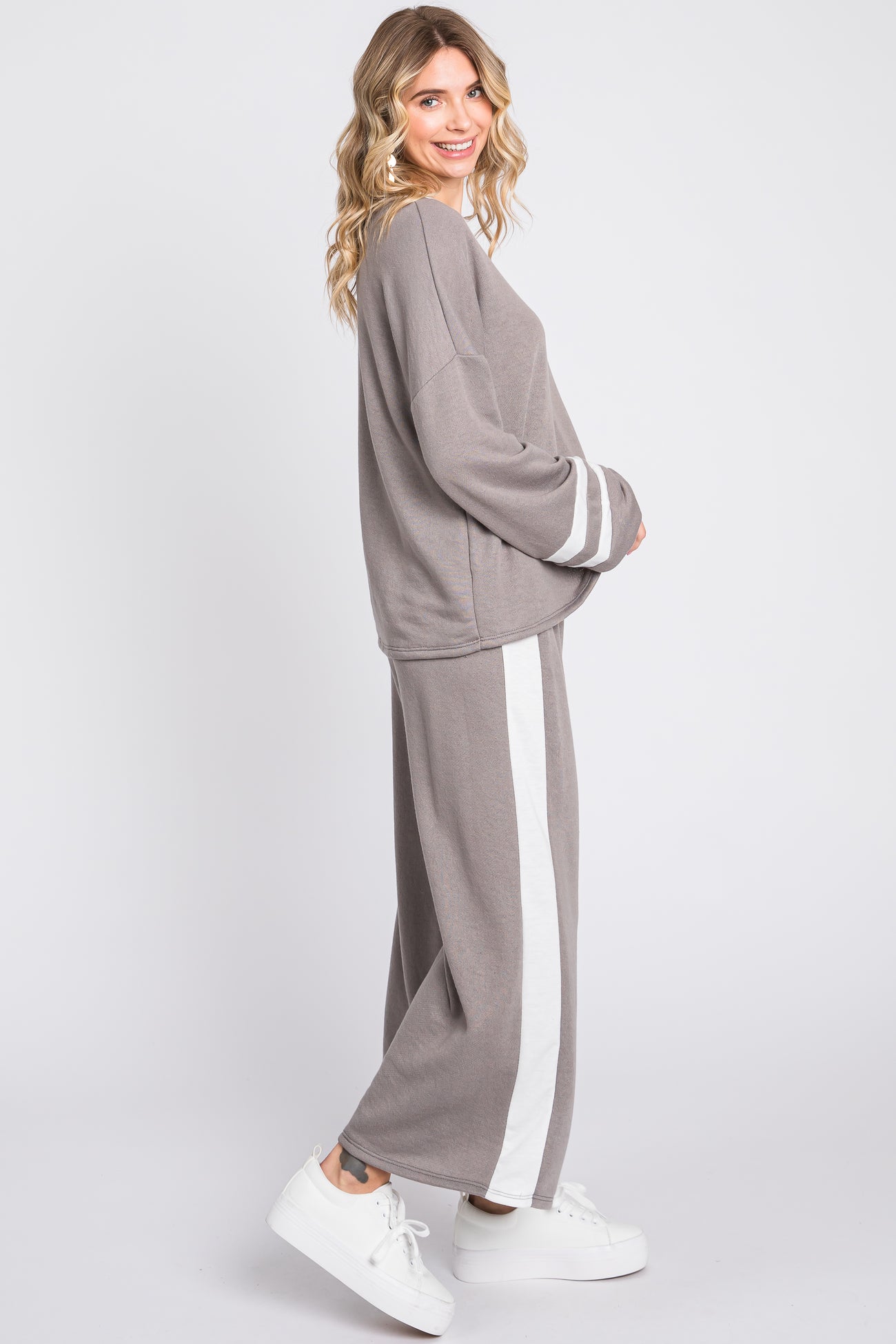 A striped set featuring long sleeves and long pants with a self-tie drawstring.