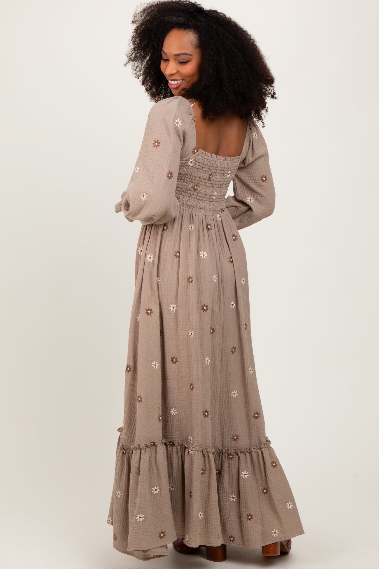 Elevate your everyday style with our Grey Taupe Long Sleeve Floral Accent Dress. Featuring a flattering smocked bodice and square neckline, this dress combines comfort and feminine charm. The long, puffed sleeves with ruffled cuffs add a romantic touch, while the delicate floral embroidery scattered throughout brings subtle elegance. Made from lightweight, breathable fabric, it flows gracefully to a ruffled hem maxi length, perfect for any season. Whether for casual outings or special occasions, this versatile dress pairs beautifully with sandals or heels. Embrace timeless beauty and effortless grace in this must-have wardrobe staple.