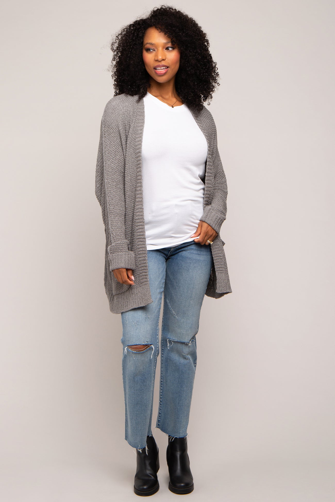 A cardigan featuring front pockets, an open front and dolman cuffed long sleeves.