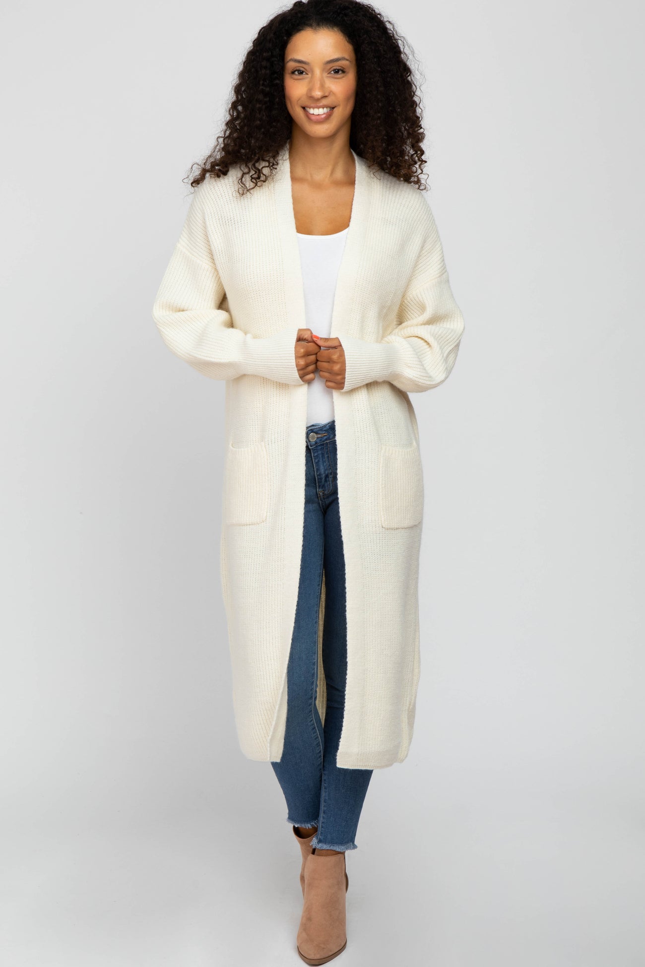 A soft knit long cardigan featuring long bubble sleeves and front pockets.