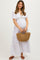 A solid maternity maxi dress featuring a tiered skirt, a crochet lace trim, short flutter sleeves, a self-tie back and a v-neckline. Skirt is double lined.