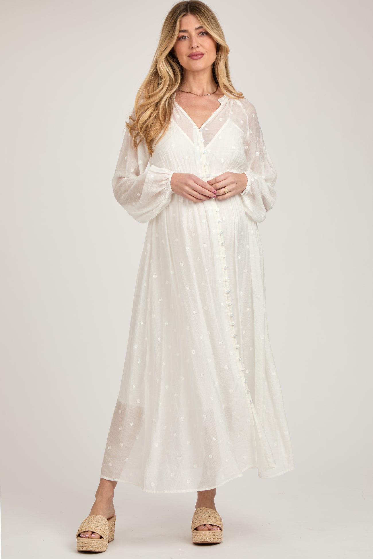 A solid floral embroidered maternity maxi dress in a long sleeve button down style. Dress is semi sheer with camisole dress underneath.