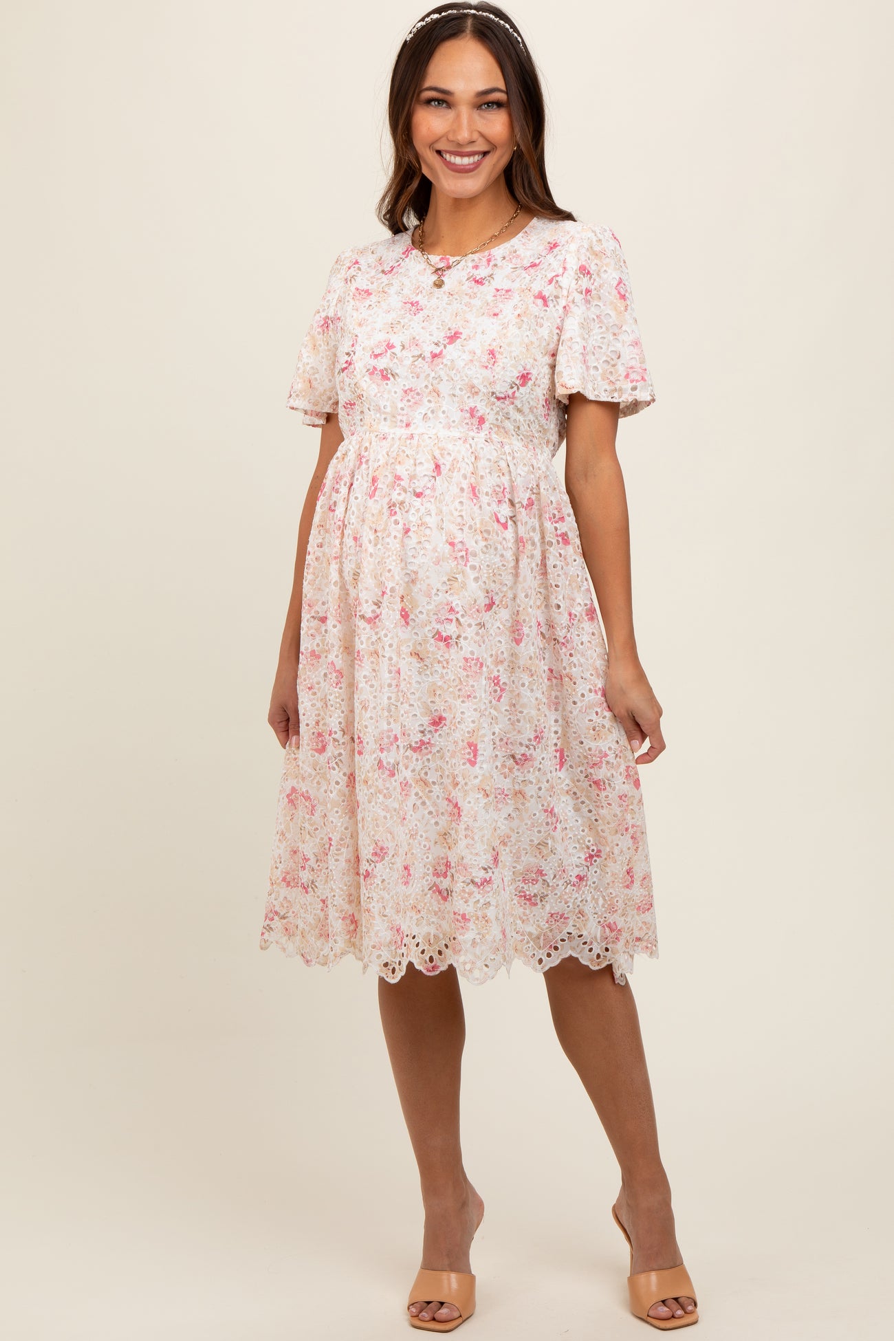 Ivory Floral Embroidered Eyelet Maternity Midi Dress