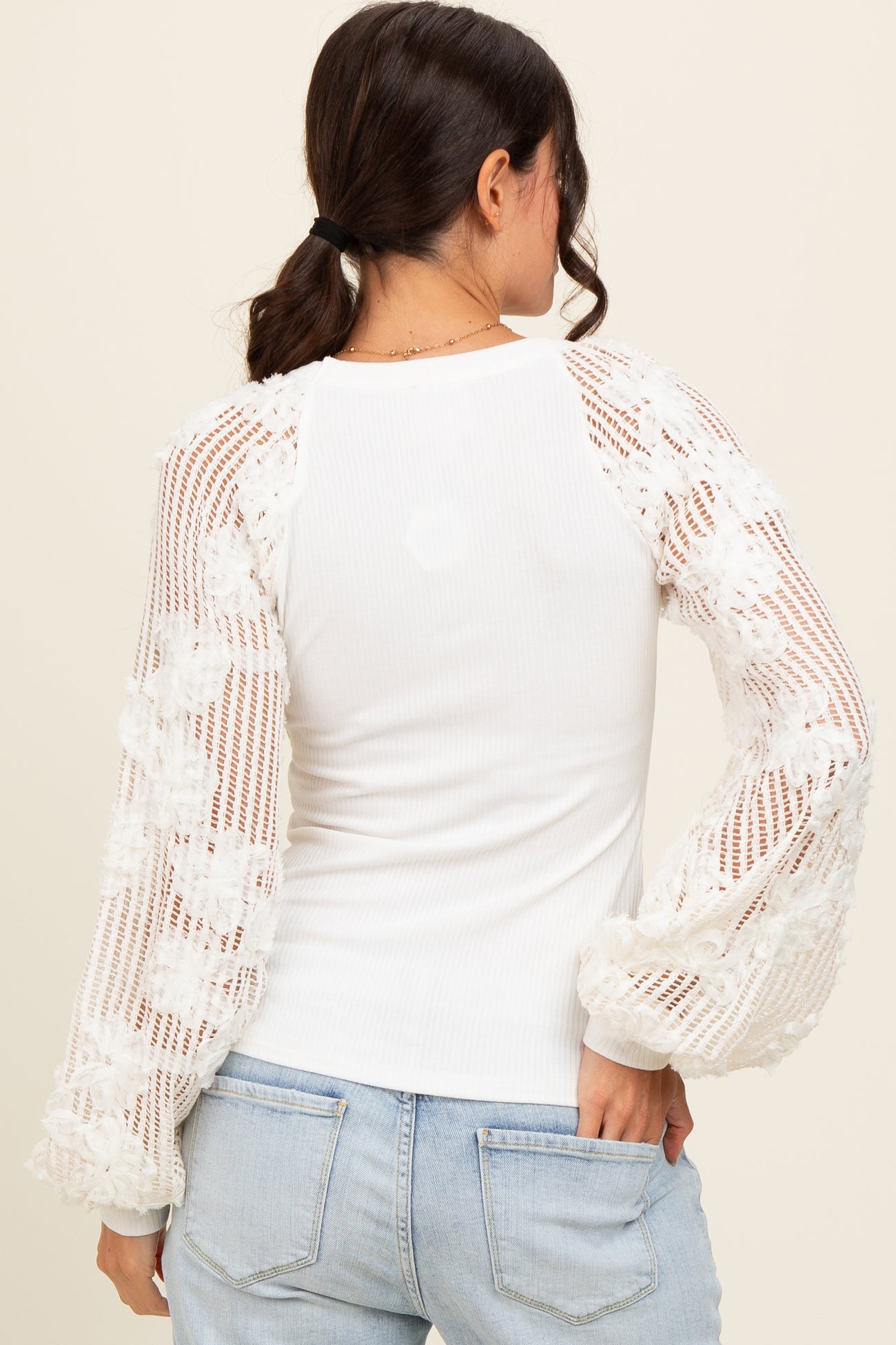 Elevate your everyday style with our Ivory Floral Lace Balloon Sleeve Top. Featuring delicate floral lace sleeves with an airy, balloon silhouette, this top adds a romantic touch to any outfit. The body is crafted from soft, ribbed fabric for a comfortable and flattering fit, while the round neckline offers classic simplicity. Perfect for pairing with jeans for a casual day out or with a skirt for a more polished look. Embrace effortless elegance and feminine charm with this versatile piece, a must-have addition to your wardrobe. Available in ivory—a timeless color that complements any style.