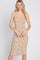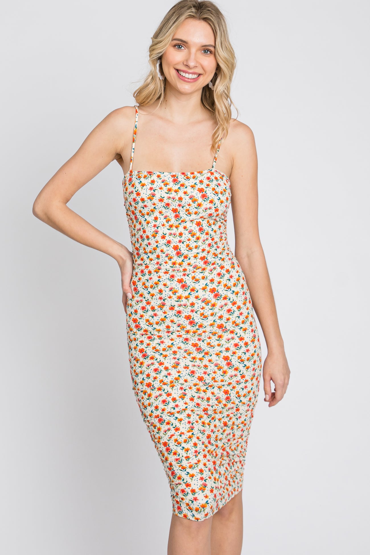A floral print ribbed dress featuring ruched sides and a square neckline. Double lined.