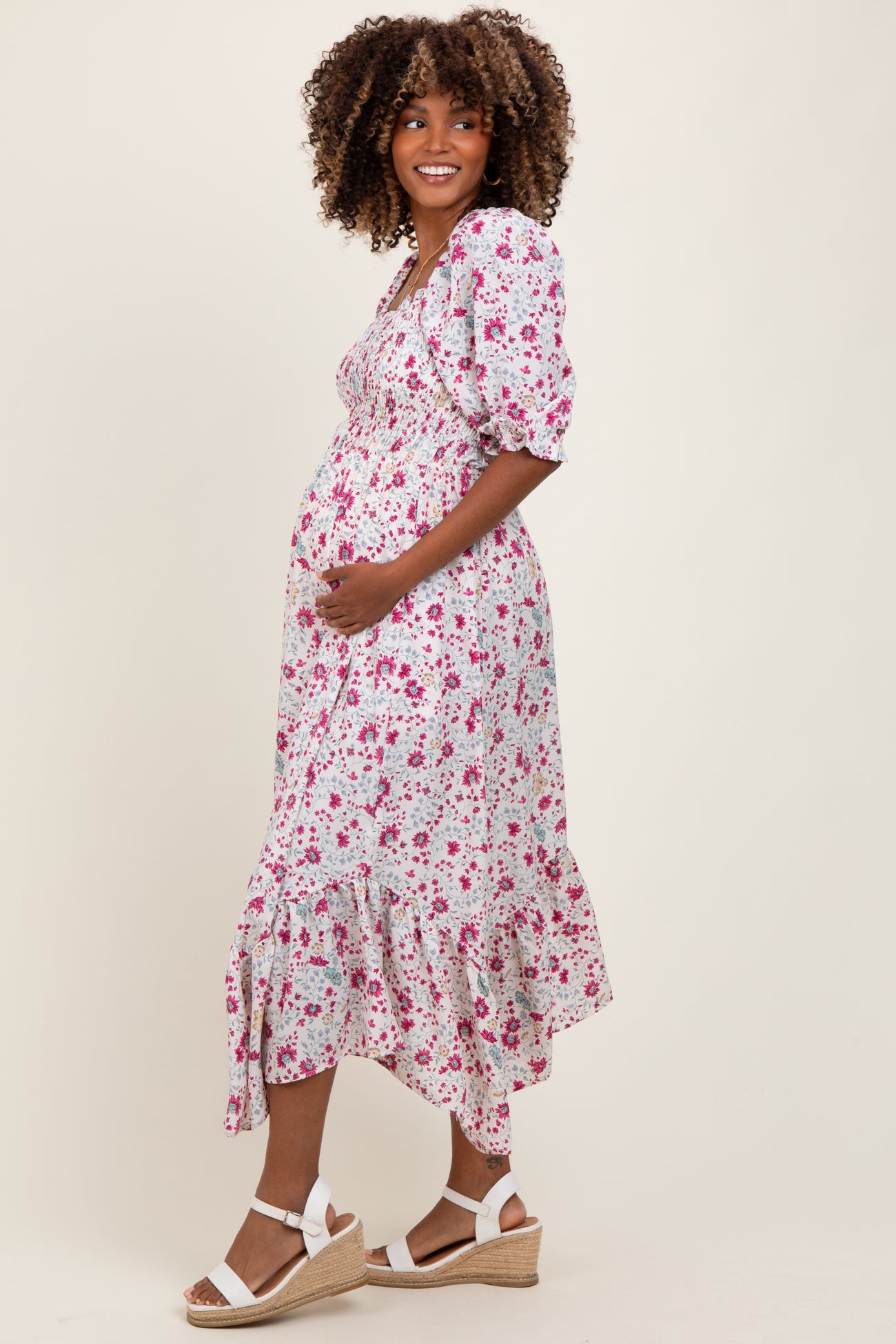 Ivory Floral Smocked Handkerchief Hem Maternity Maxi Dress