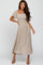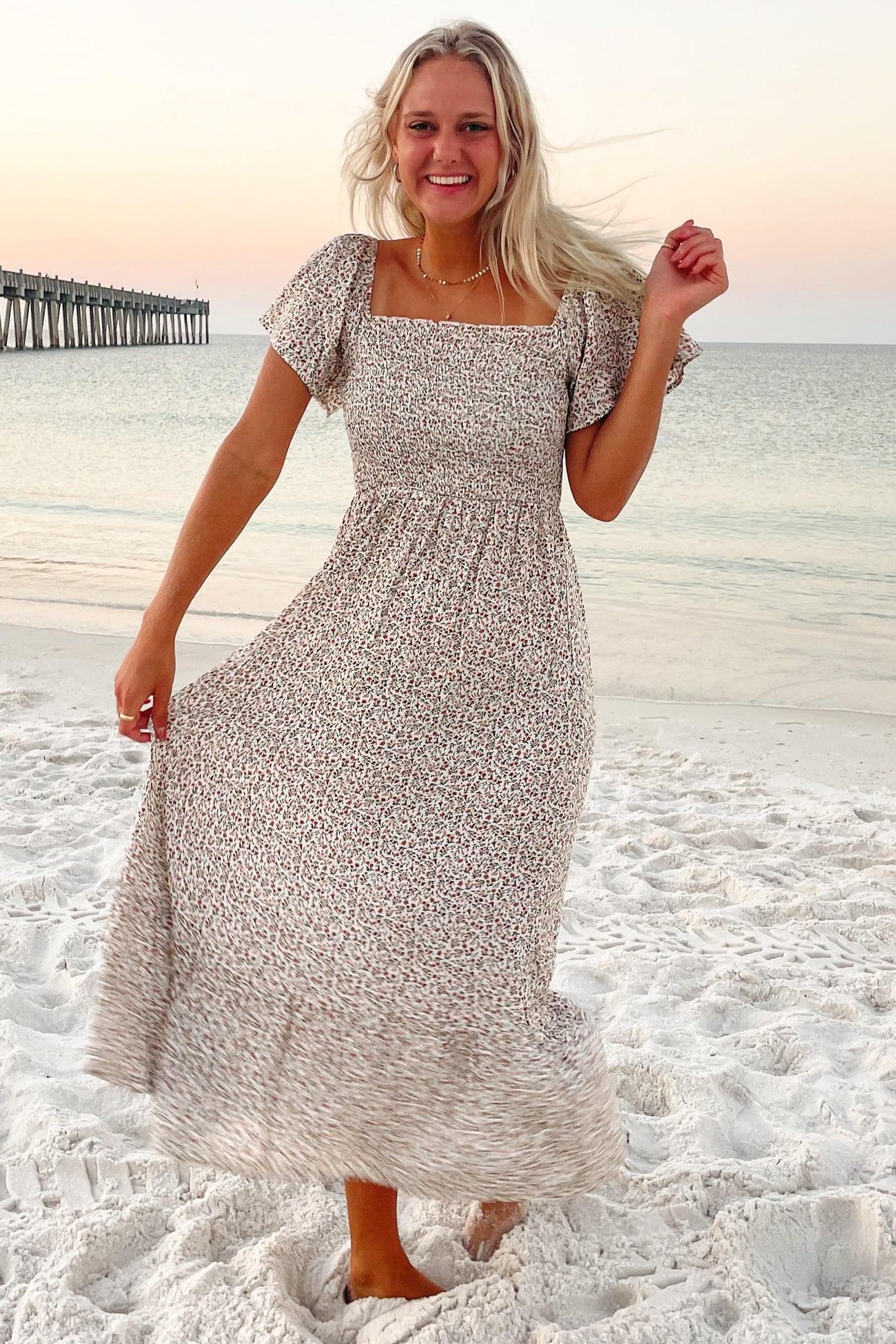A floral maxi dress featuring a smocked top, short sleeves, a ruffle hem and a square neckline.