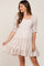 A floral printed maternity mini dress featuring a square neckline with ruffle trim at the shoulders, short puff sleeves, a smocked elastic back, and empire waist, a ruffle hem, side pockets and double lined.