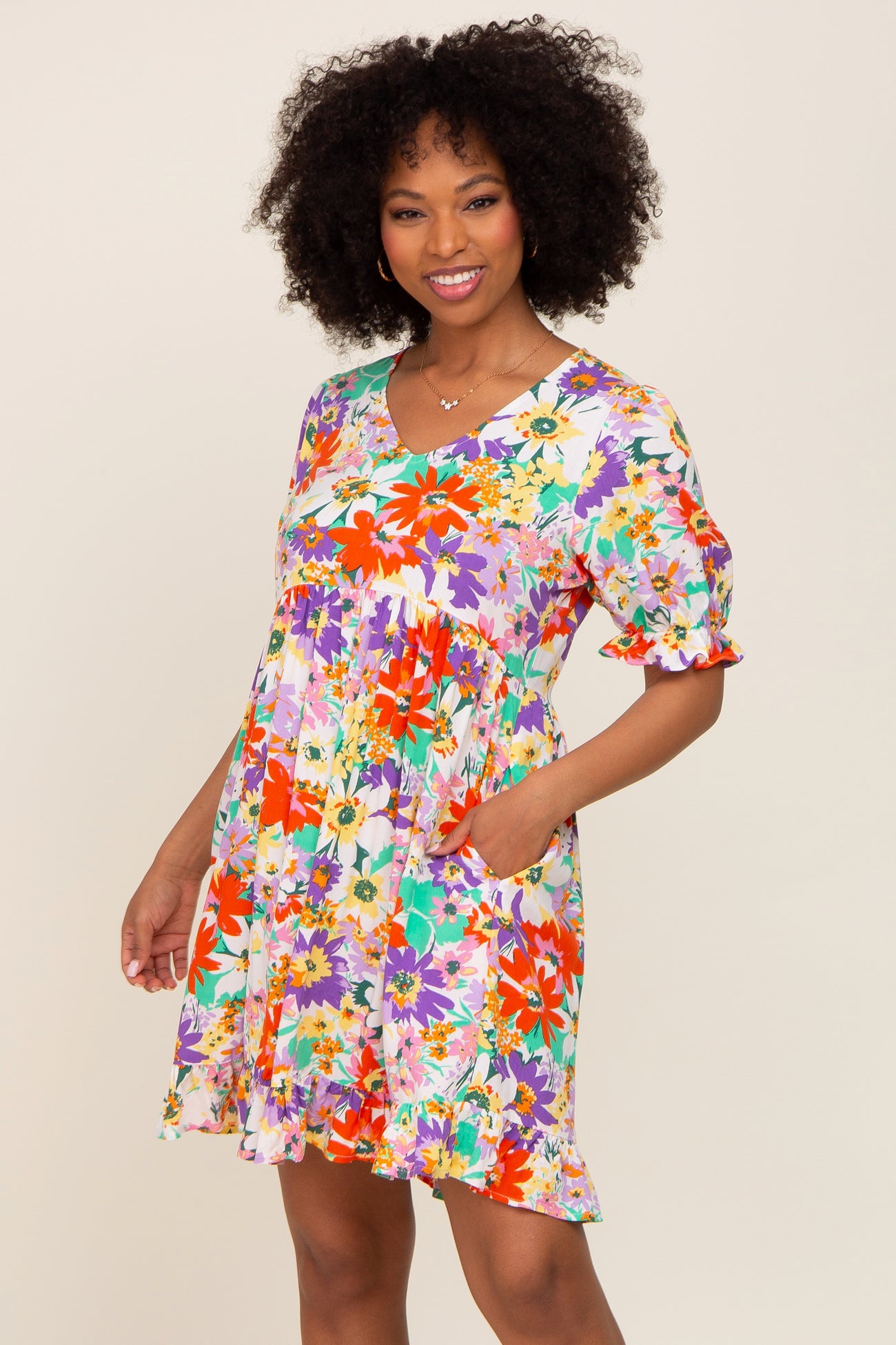 A floral maternity dress that features short puff sleeves, a v-neckline, side pockets, a back keyhole button closure, and a gathered bottom hem.