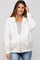 A solid maternity sweater featuring a front zipper closure, a drawstring hood, long raglan sleeves, and side pockets. Fleece lined.