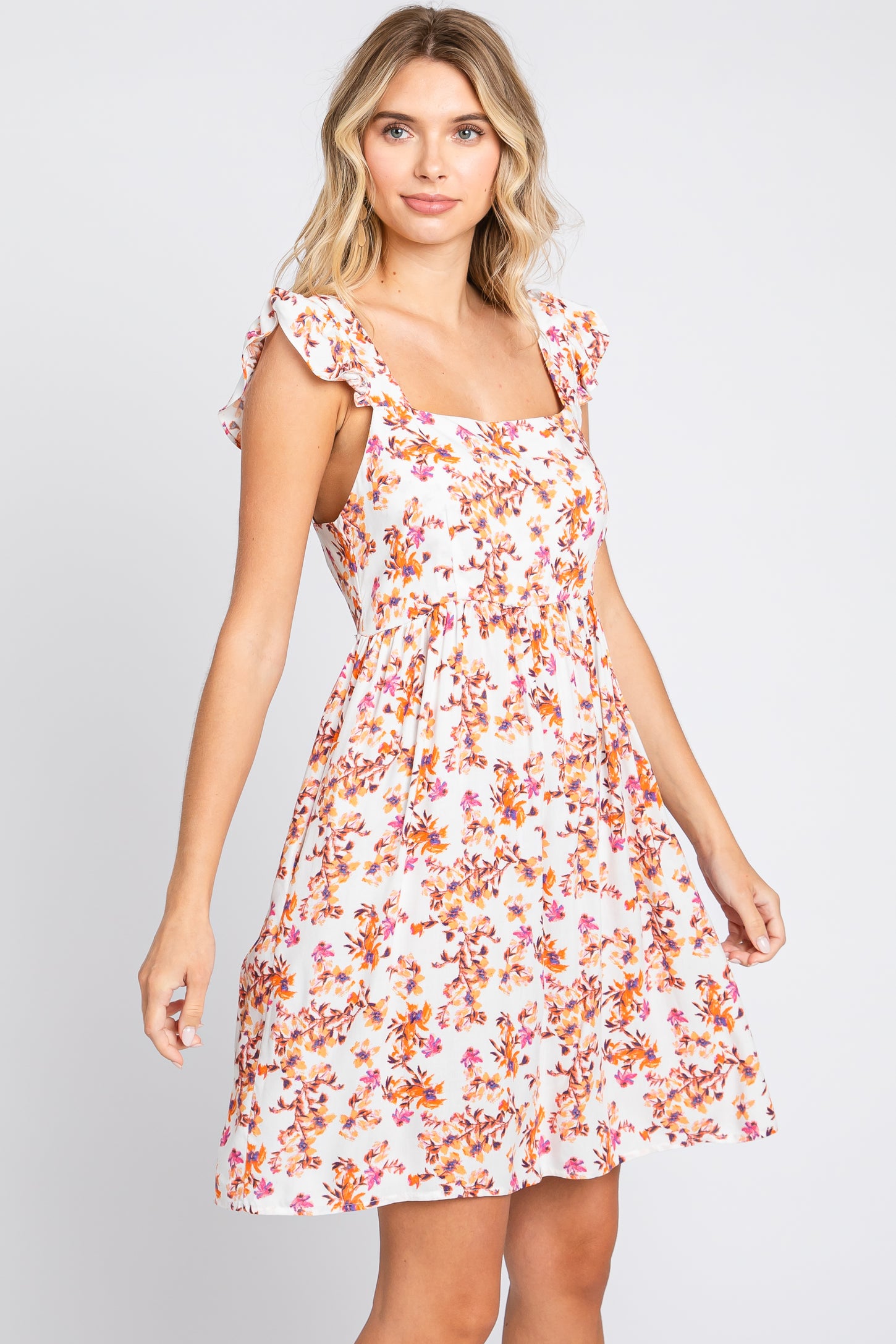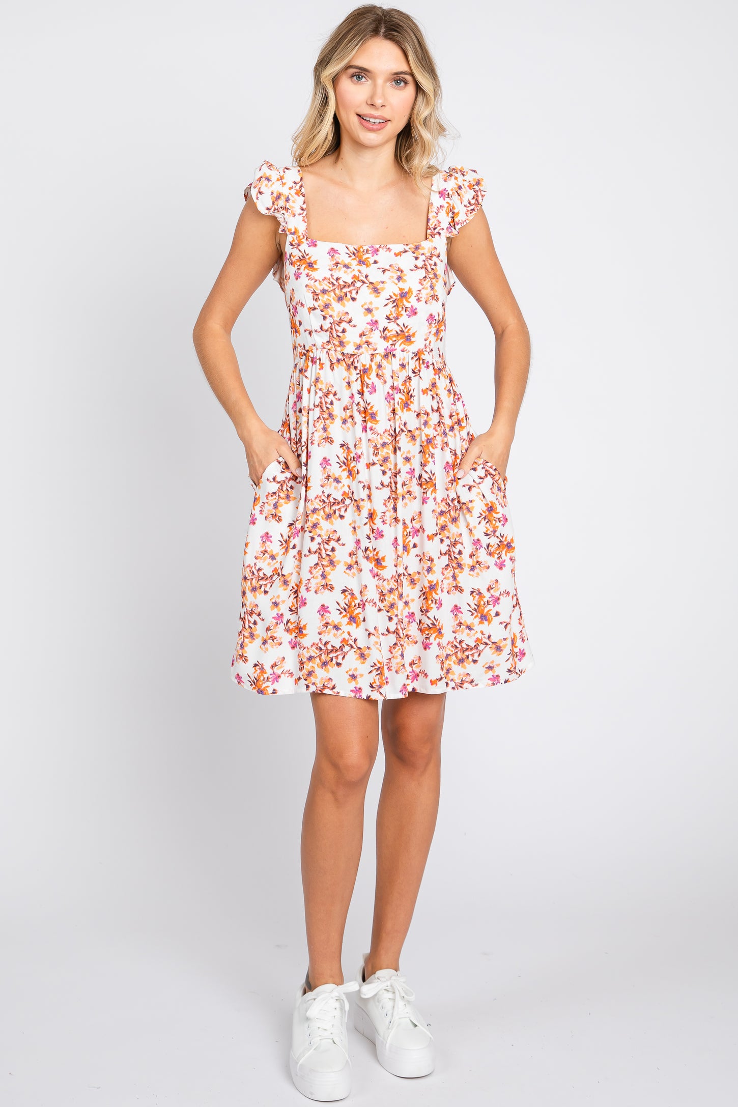 Details A leaf print dress with a squared neckline, ruffle trim cap sleeves, a back cutout, and side pockets. Content + Care