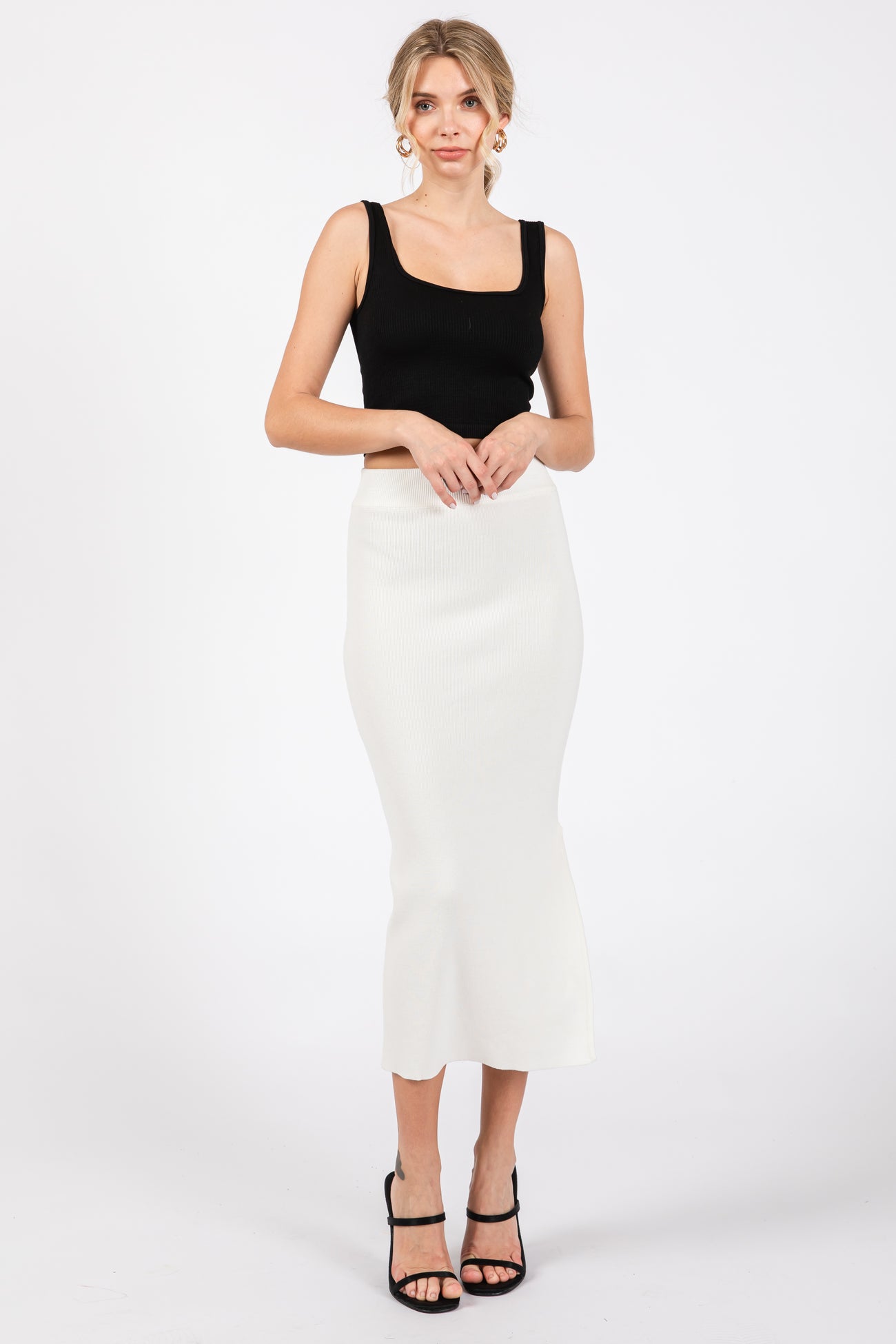 A ribbed midi skirt with an elastic waistband, and a side slit.