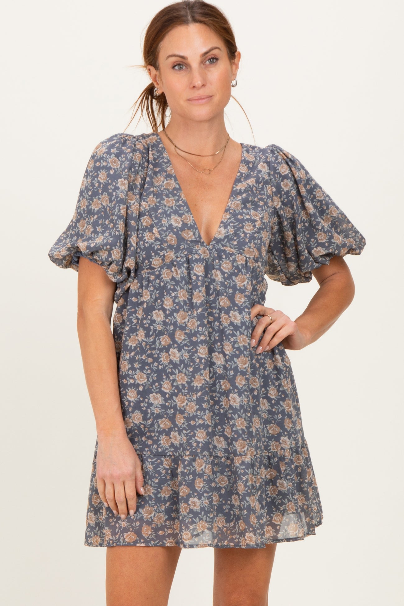 Elevate your maternity wardrobe with this charming floral mini dress designed to keep you both comfortable and stylish throughout your pregnancy. Featuring a flattering V-neckline and short puff sleeves, this dress provides a breathable and airy fit perfect for warmer days. The flowing A-line silhouette gently skims over your baby bump, allowing for ease of movement and a relaxed feel. Crafted from soft, lightweight fabric, it offers all-day comfort while maintaining a chic look. Pair it with sandals or heels for a casual outing or a special event. A must-have staple for maternity wear that effortlessly combines fashion and function.