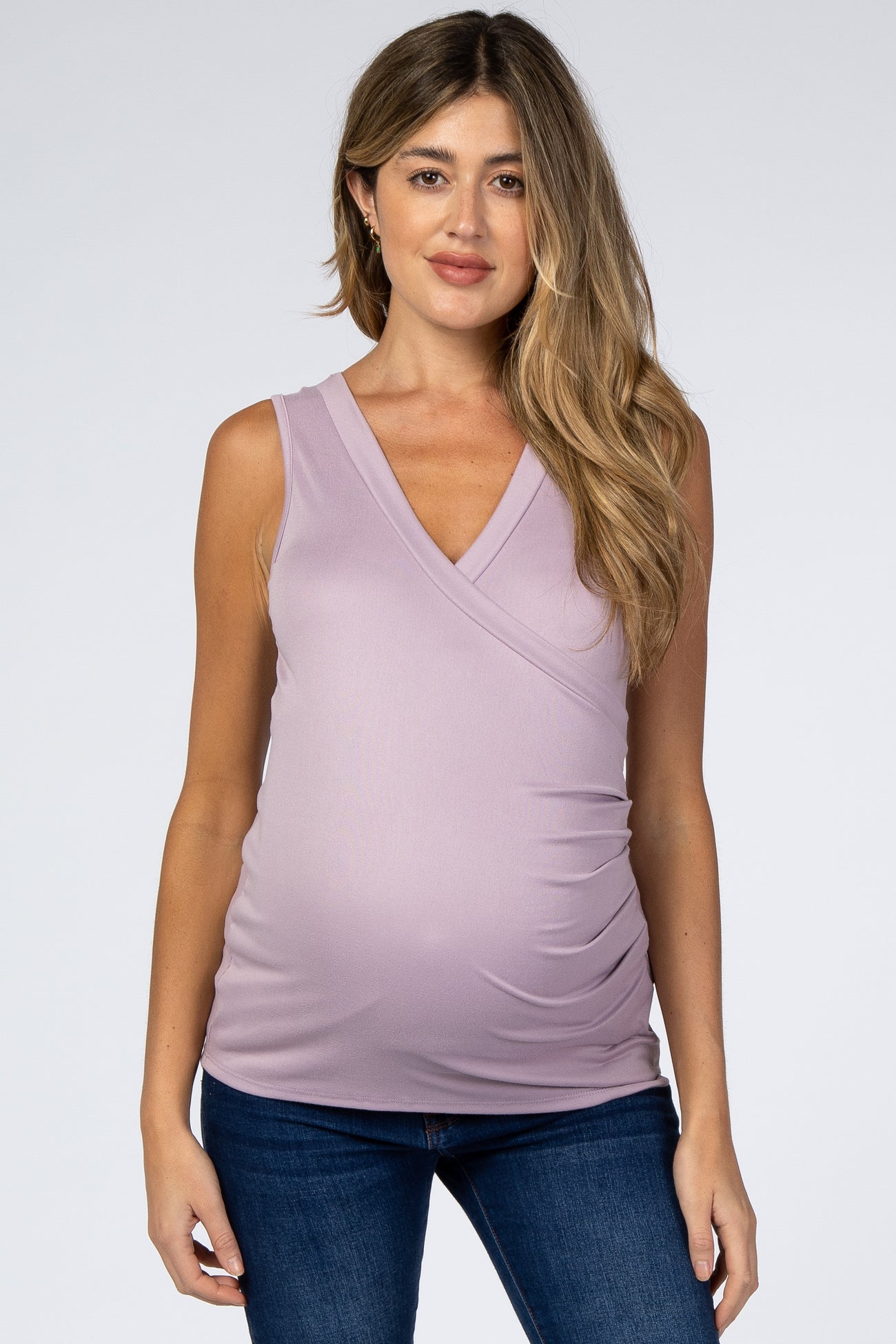A sleeveless maternity nursing top. Features crossover neckline and side ruching.
