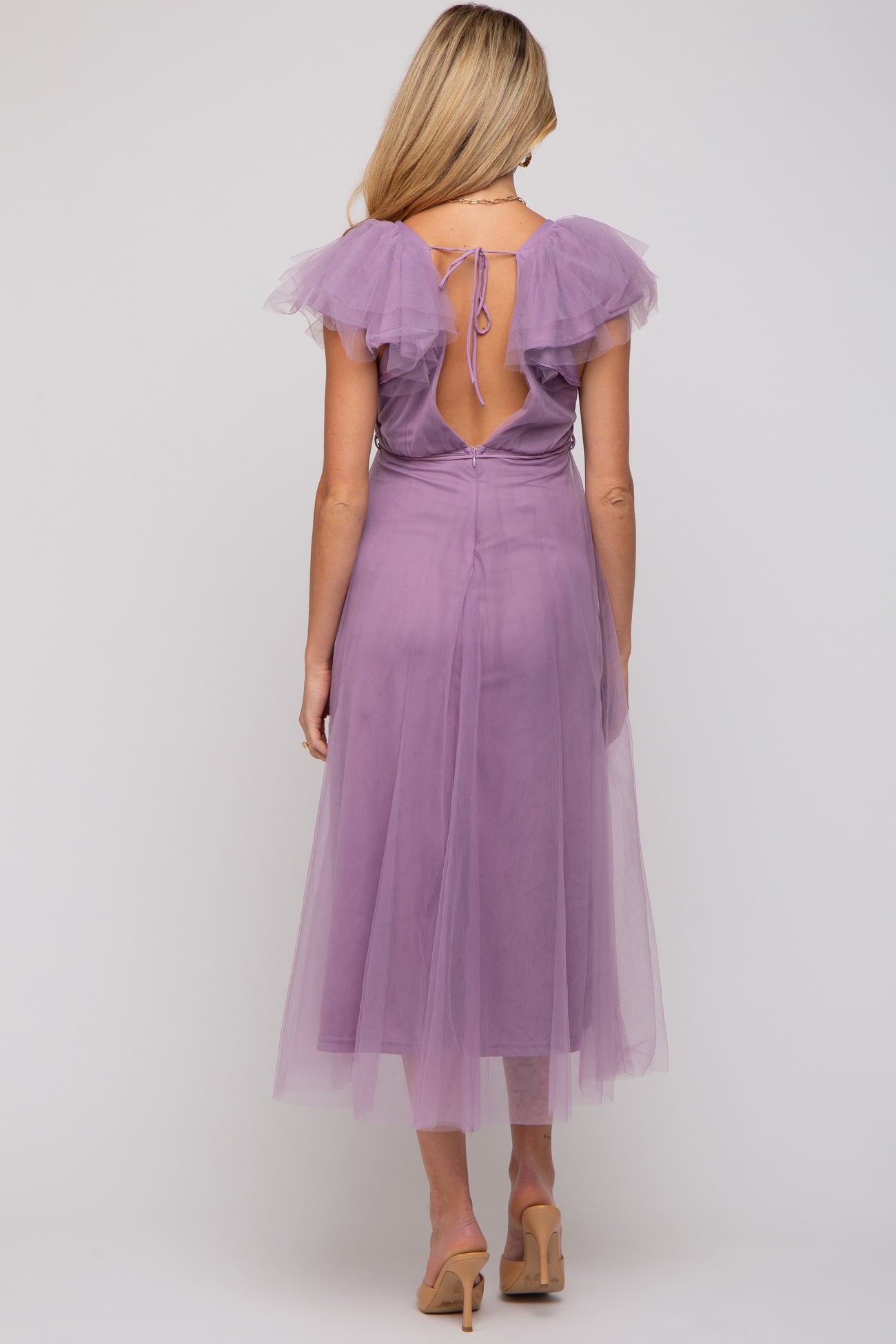 Lavender Deep V-Neck Tulle Flutter Sleeve Maternity Midi Dress
