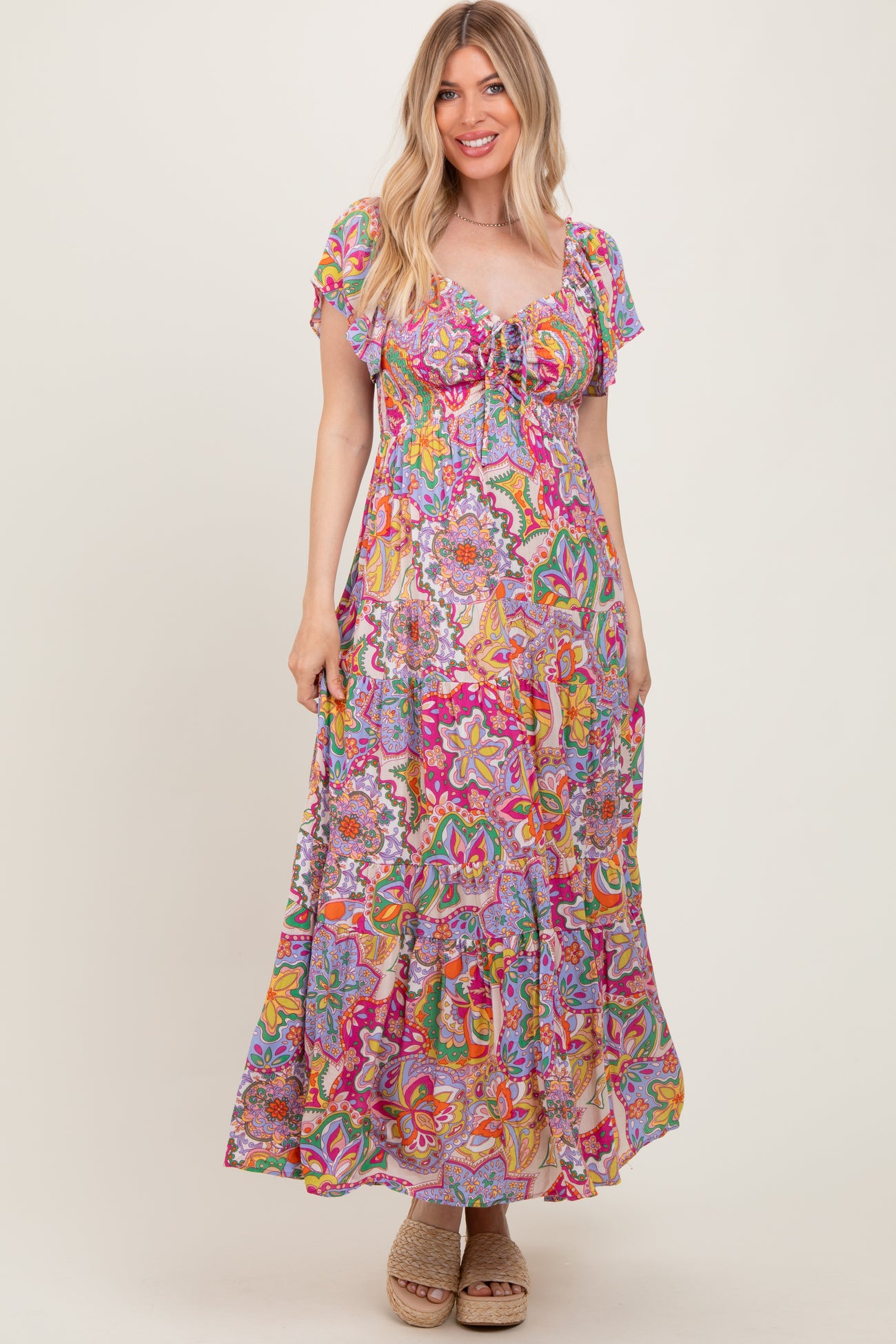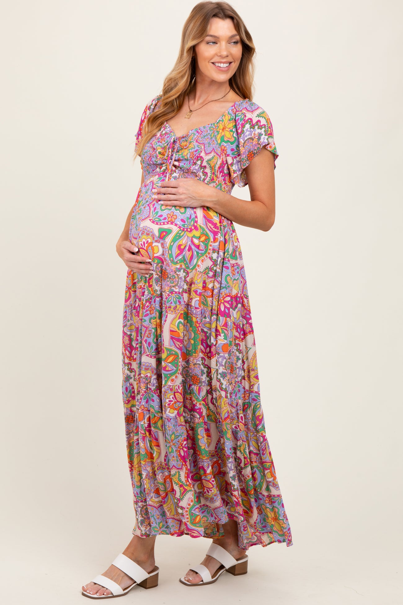Lavender Floral Paisley Smocked Tiered Maternity Maxi Dress