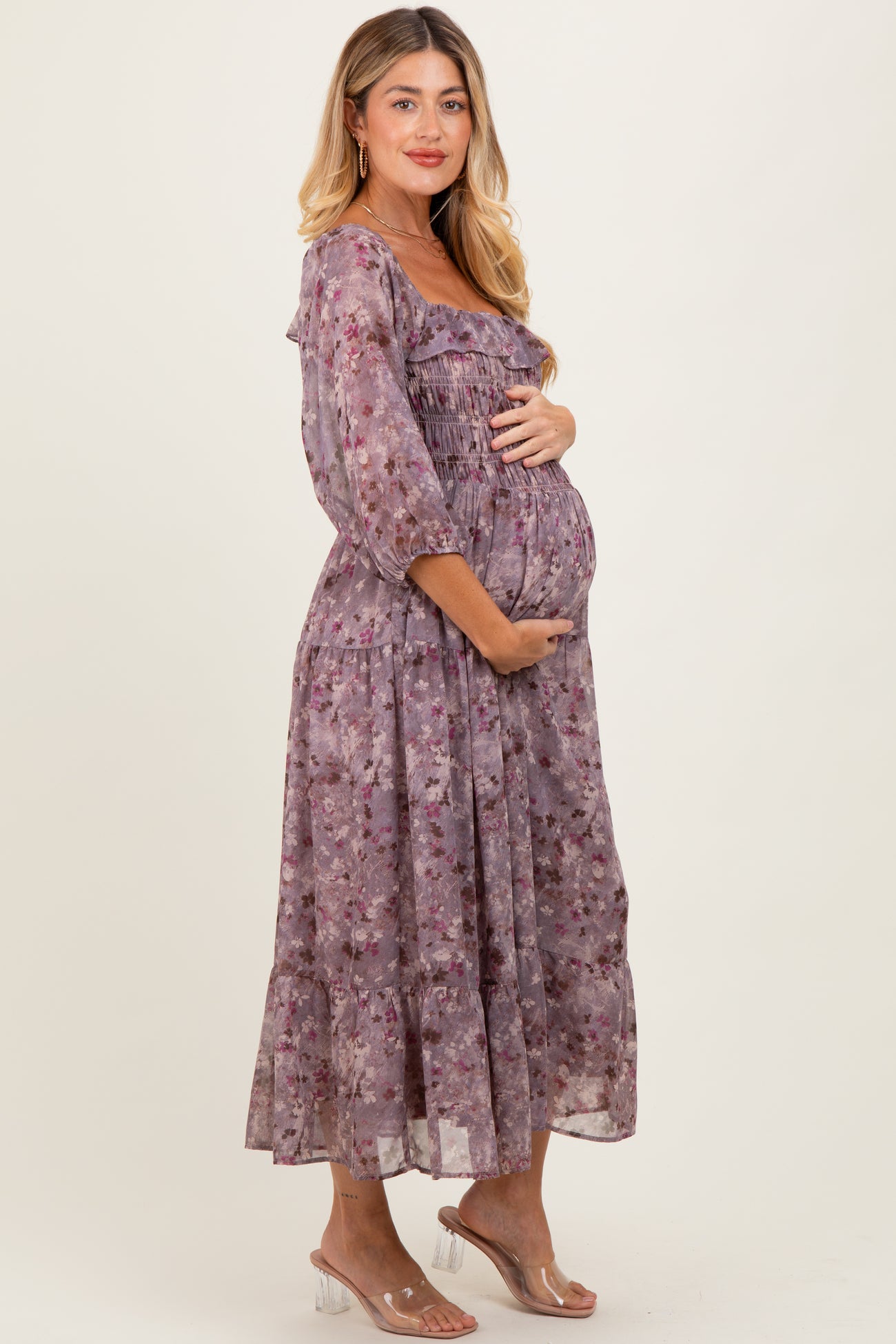 Lavender Floral Square Neck Ruffle Maternity Midi Dress