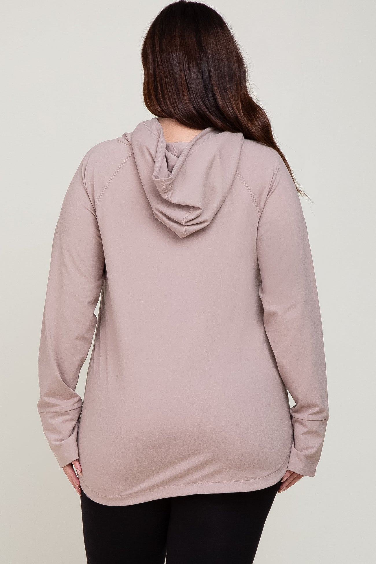 Details A solid hued active plus top featuring a hooded neckline with an adjustable drawstring, long sleeves with thumb slits and a curved hem. Content + Care