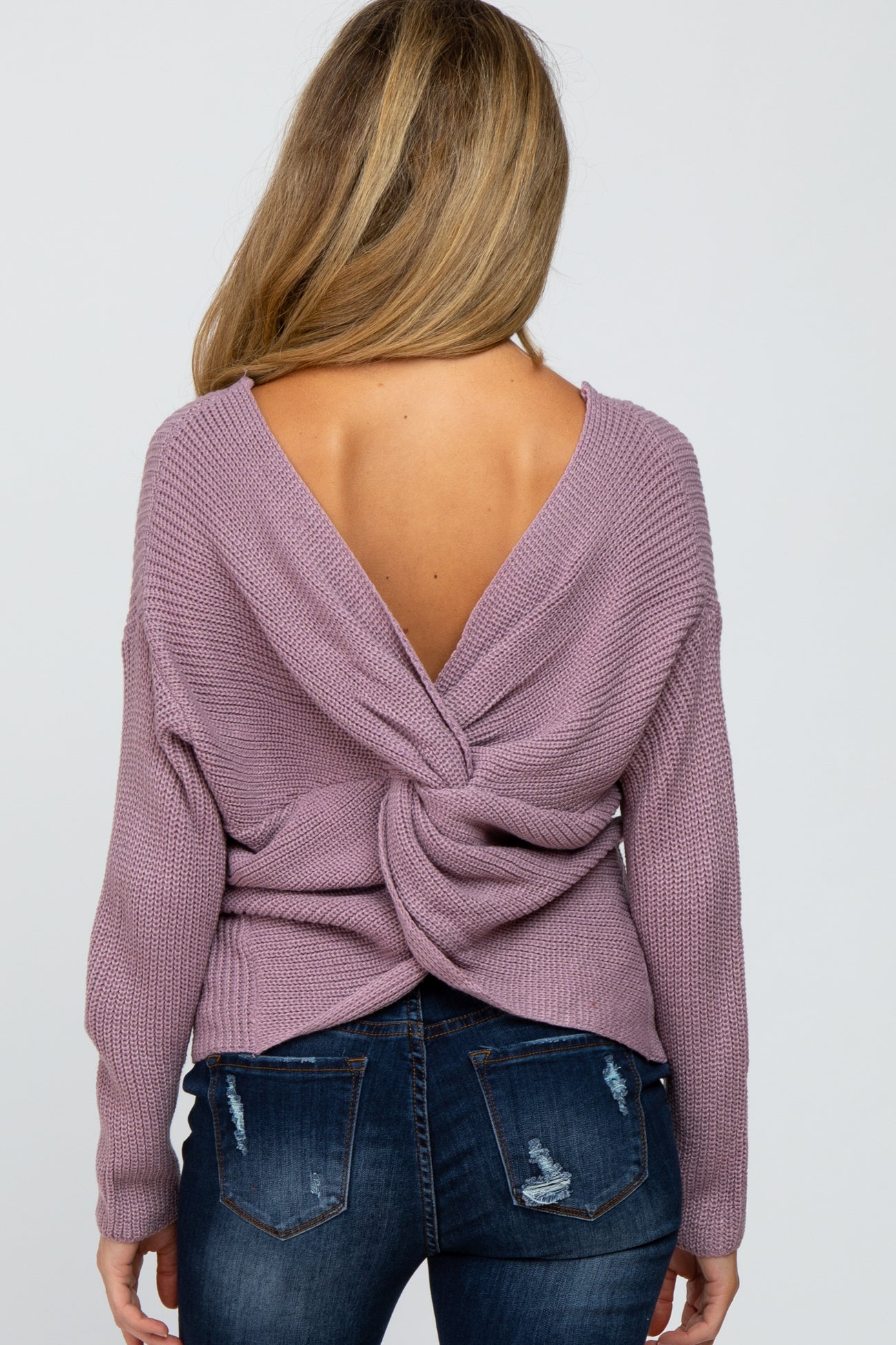 A maternity sweater featuring a rounded neckline, long sleeves and a knot back.