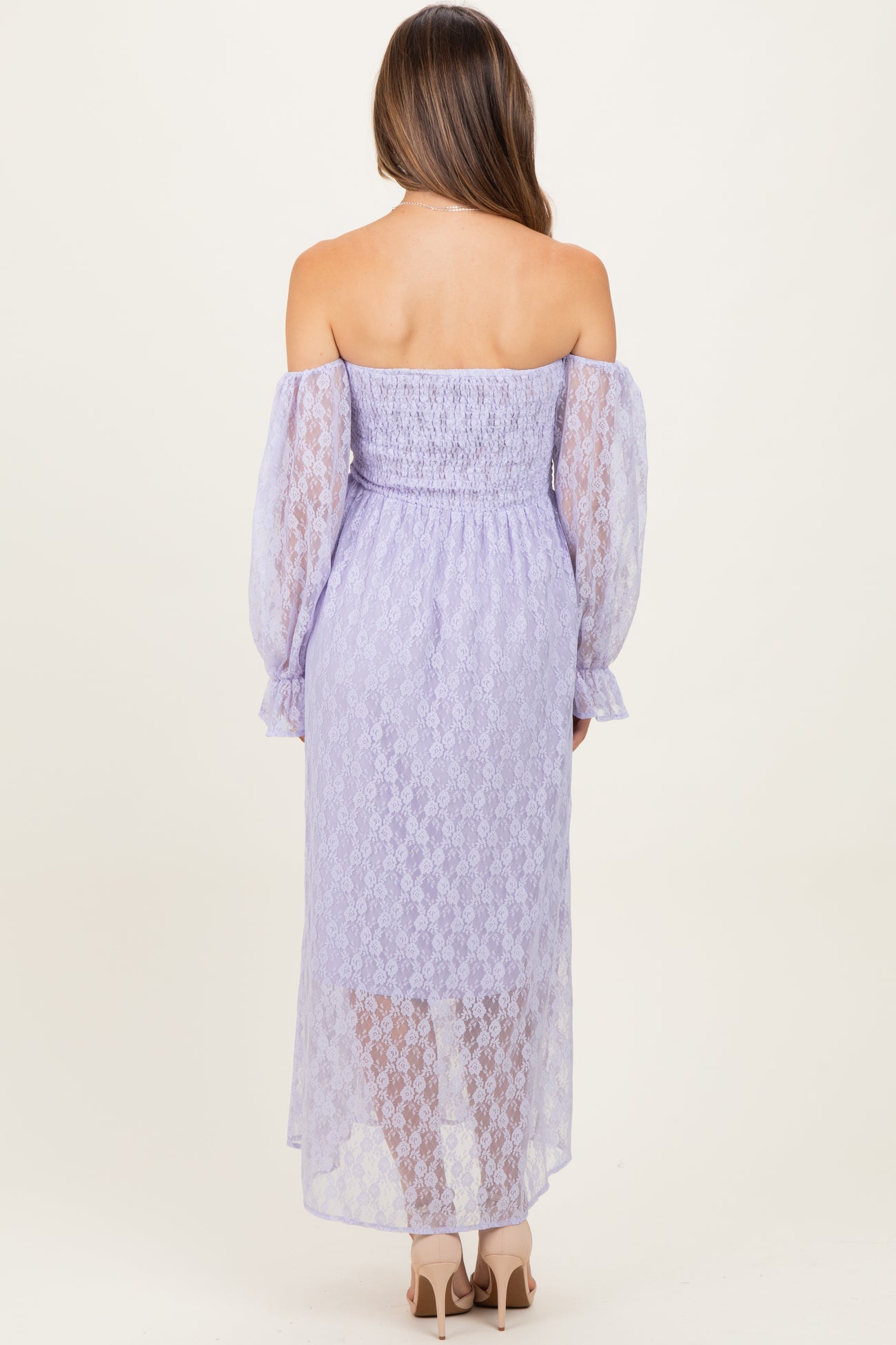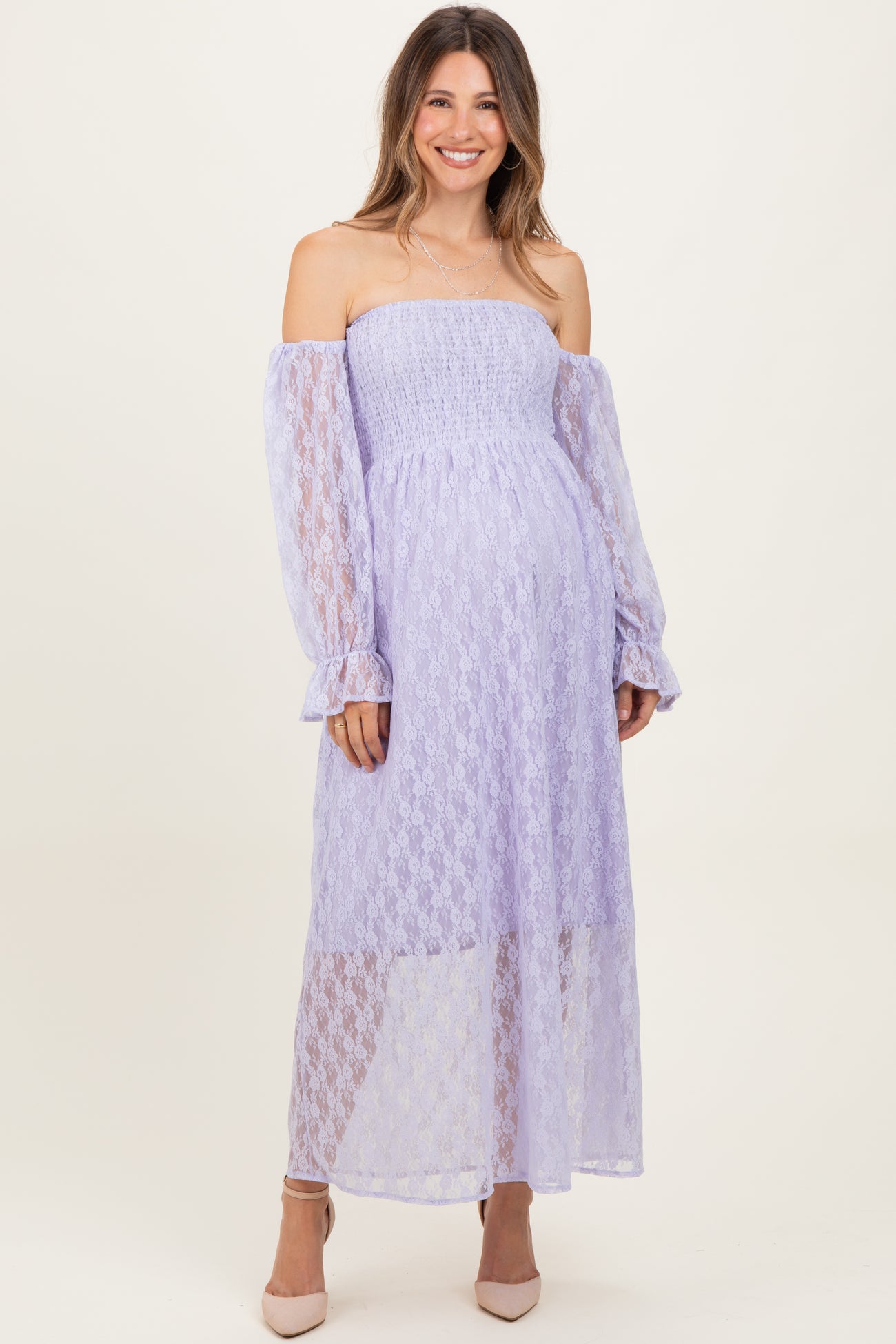 Embrace elegance and comfort with our Lavender Lace Overlay Smocked Maternity Maxi Dress. This stunning off-shoulder dress features delicate lace overlay and smocked bodice for a flattering, stretchy fit that grows with you. Sheer long sleeves with ruffled cuffs add a touch of romance, while the flowing maxi length creates a graceful silhouette. Perfect for special occasions or stylish everyday wear, this dress combines softness and sophistication to celebrate your beautiful journey. Pair it with heels or flats for an effortlessly chic maternity look. Available in multiple sizes.